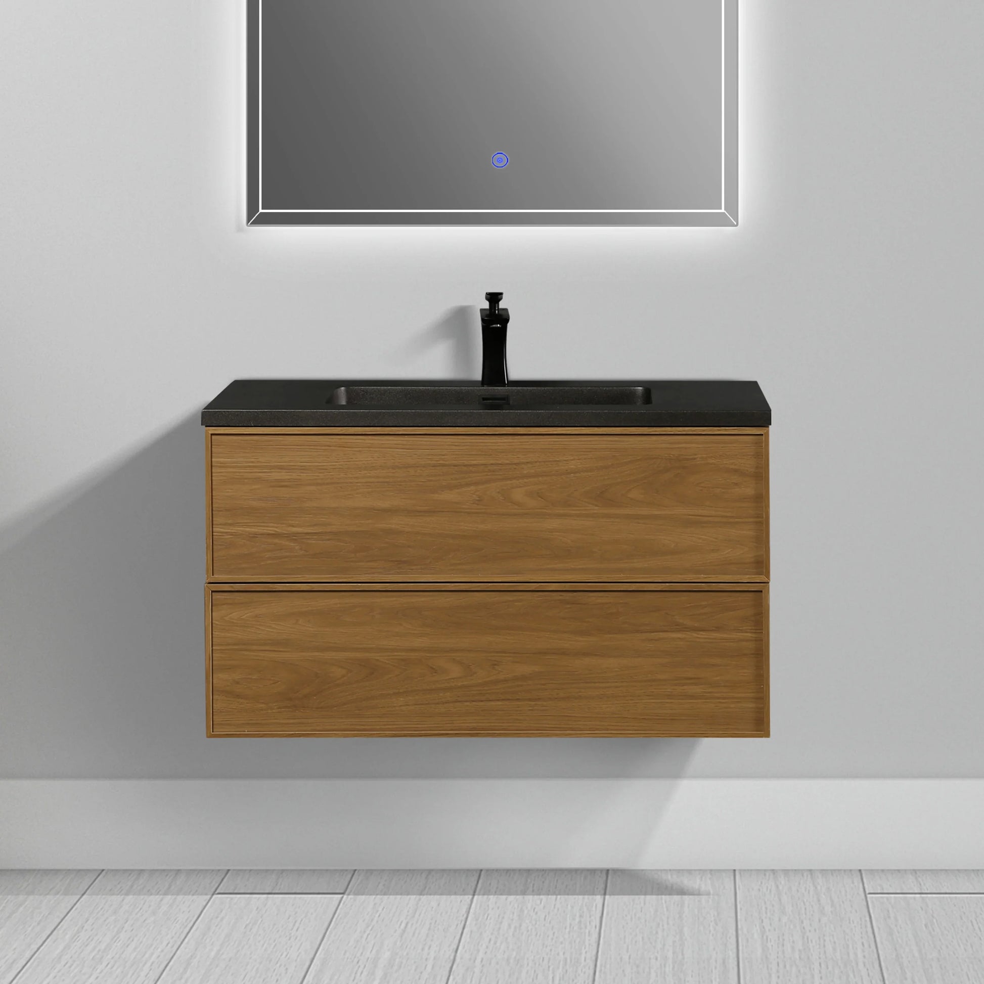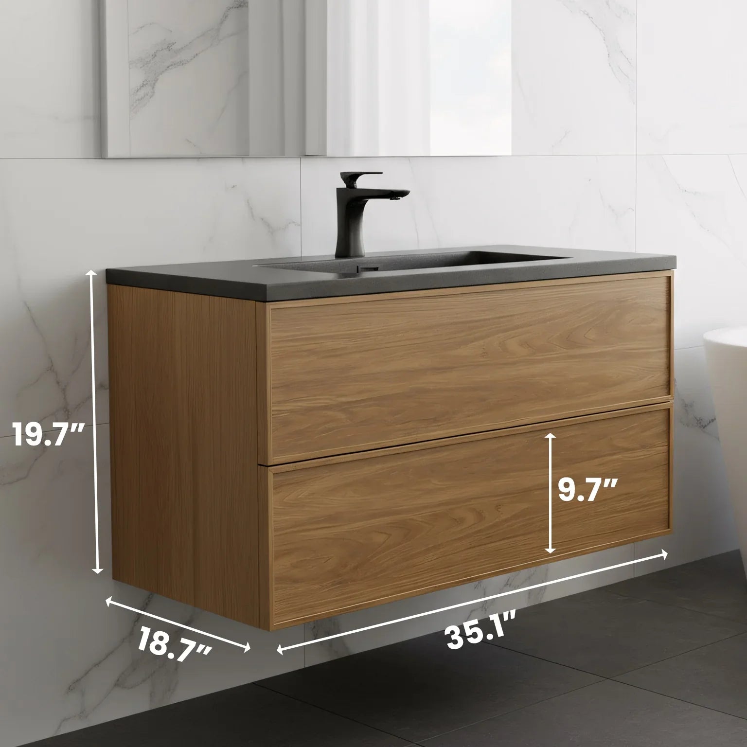 36" Honey Gold Walnut Wall Mount Bathroom Vanity with Black Engineered Quartz Countertop