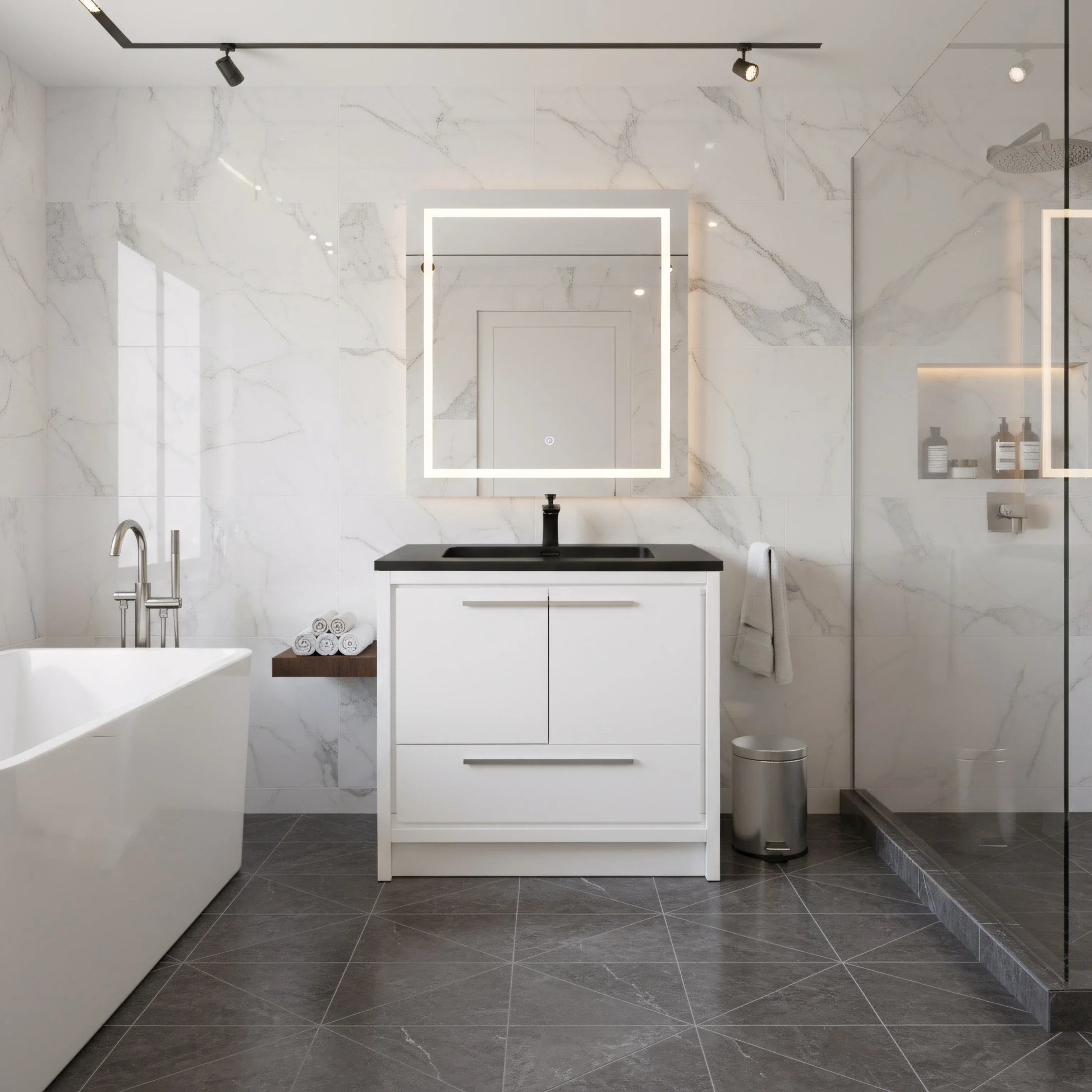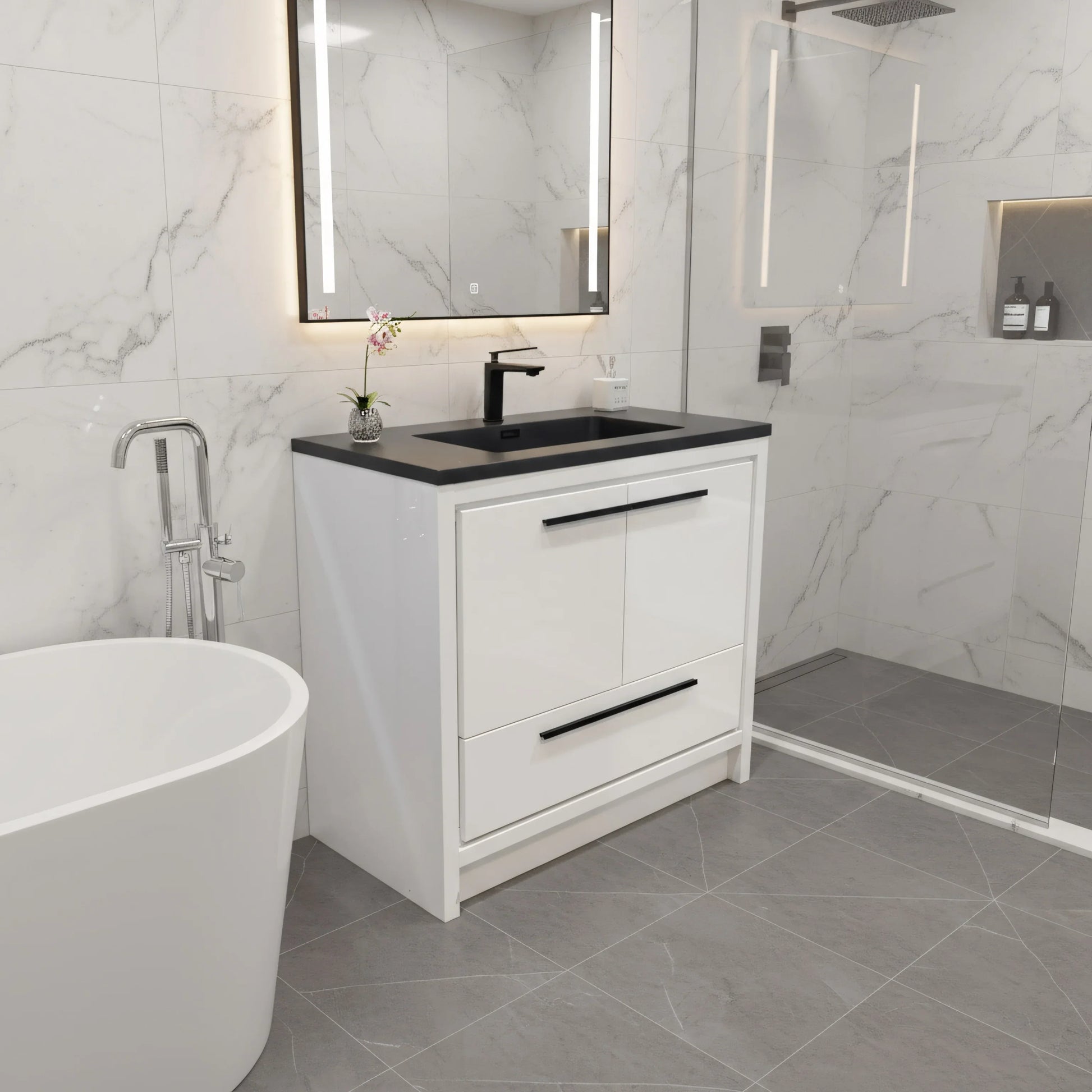 Create high-contrast modern impact with this 36″ freestanding vanity in glossy white, topped with a bold black engineered quartz countertop. A clean and confident design from the Allier Collection—perfect for minimalist and monochrome-inspired bathrooms.