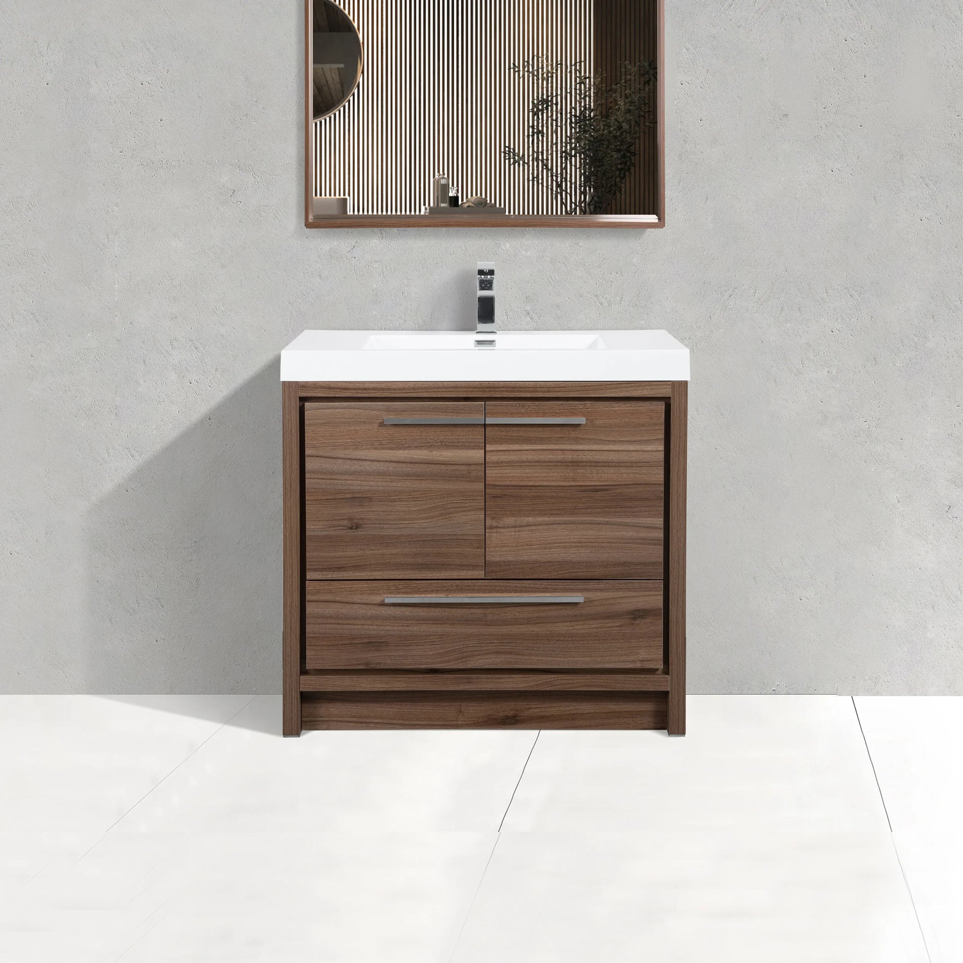 36" Walnut Freestanding Bathroom Vanity with White Polymarble Countertop