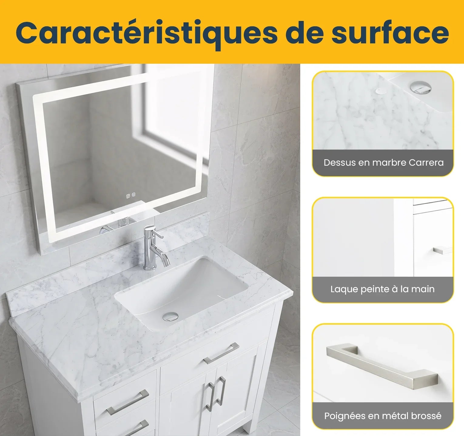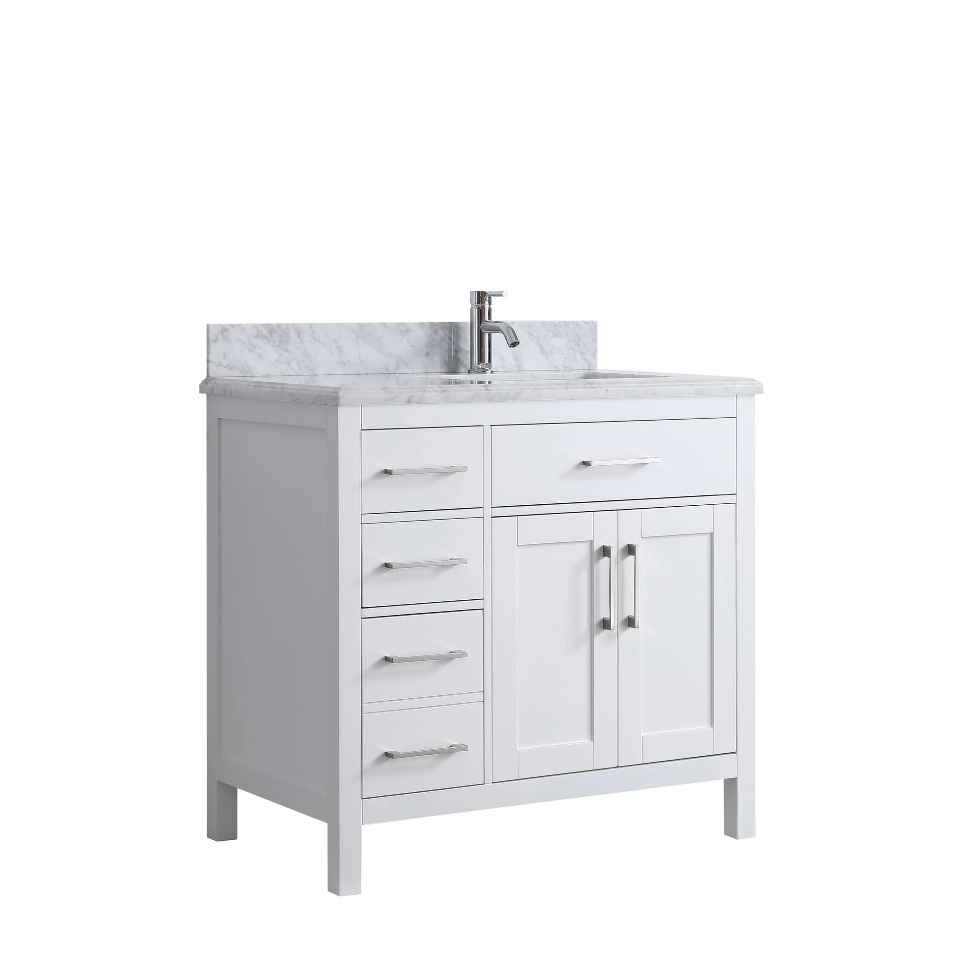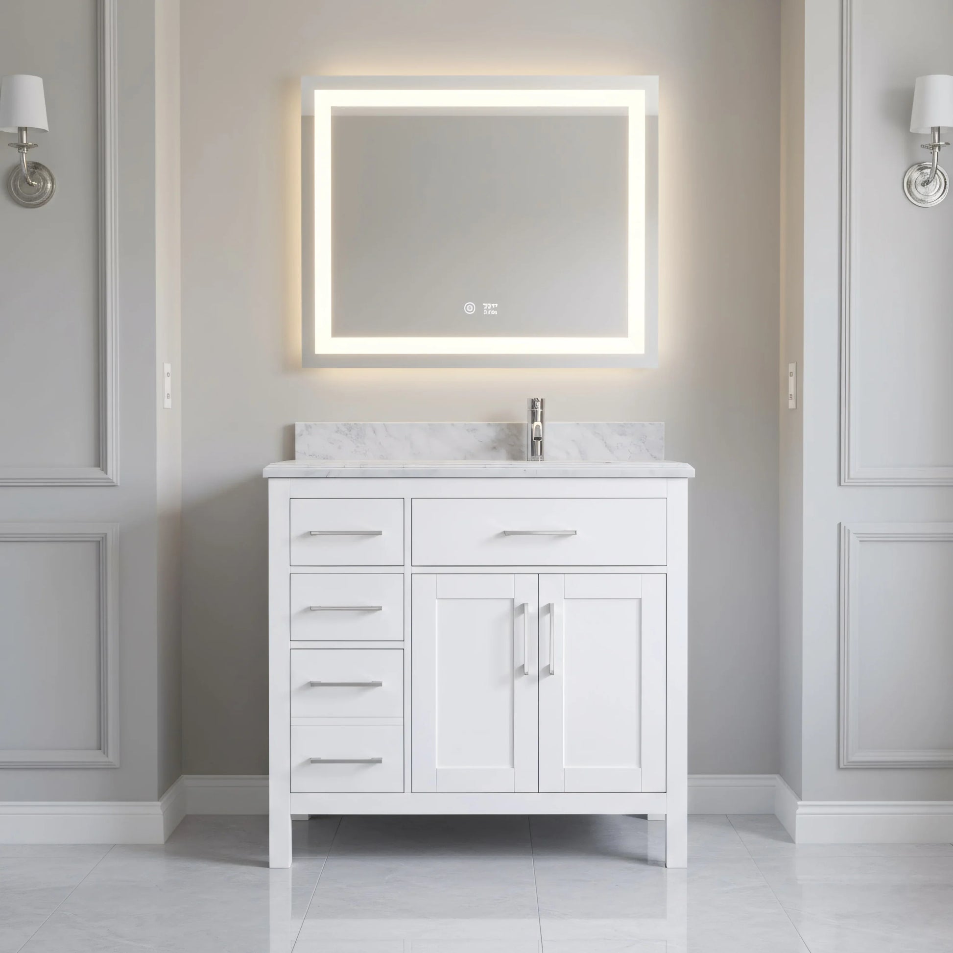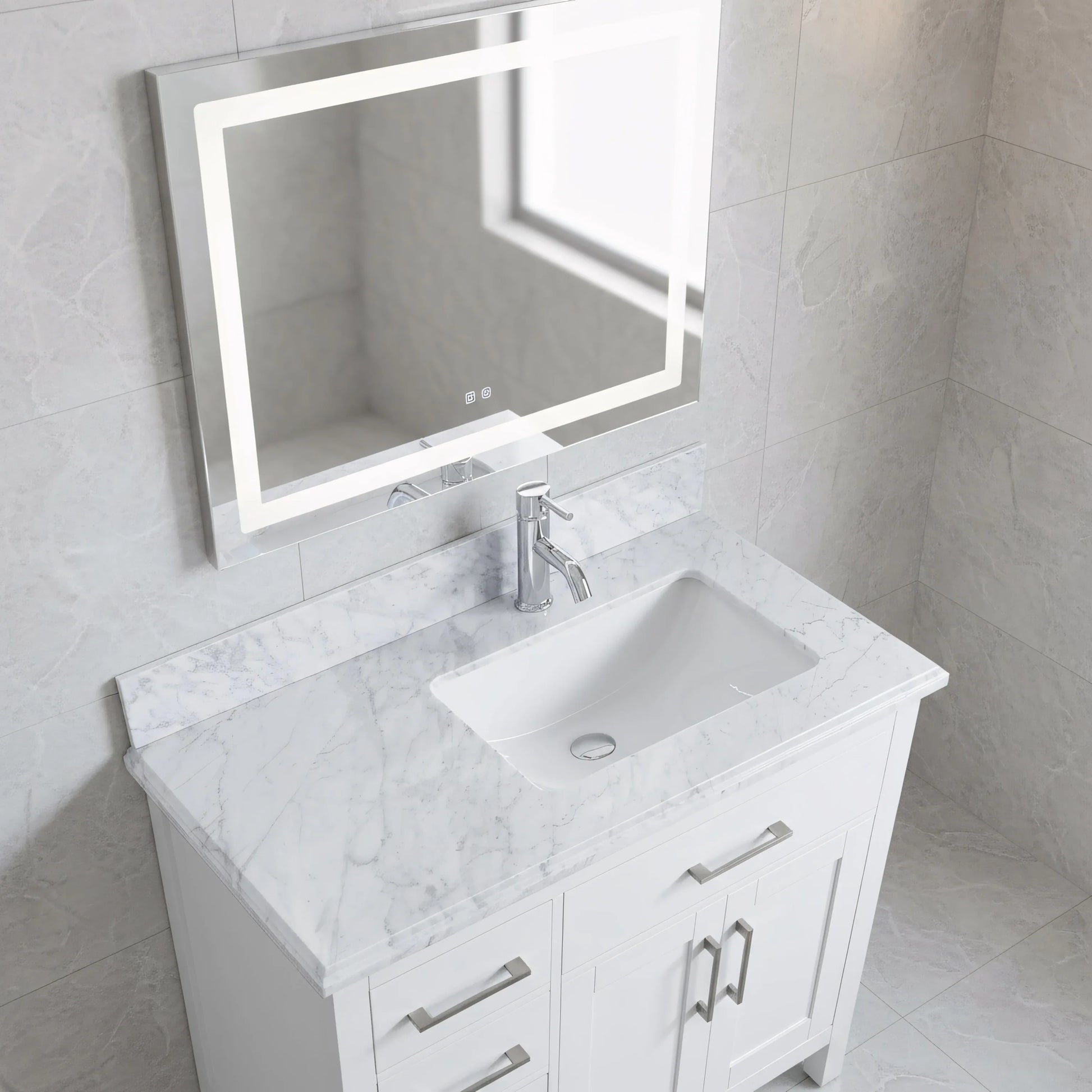 36" White Freestanding Single Sink Bathroom Vanity with Carrera Marble Countertop