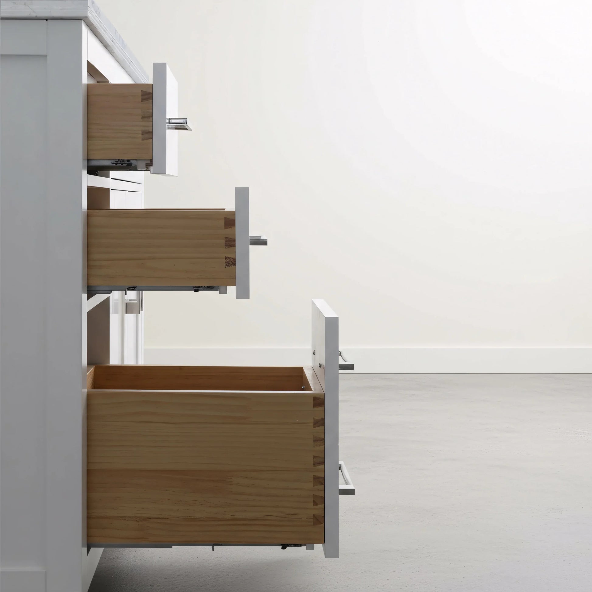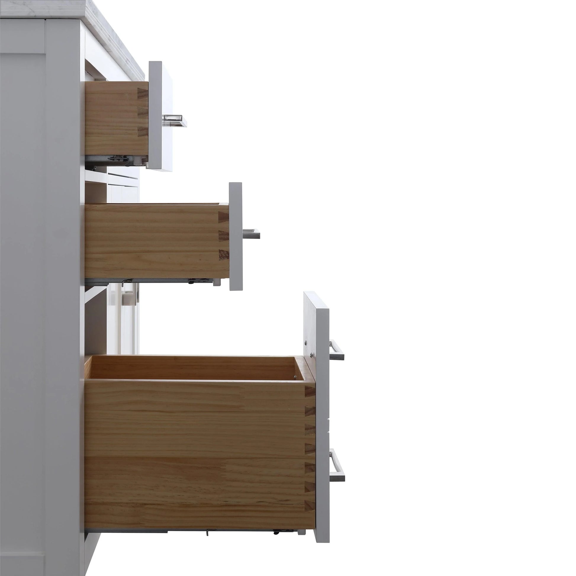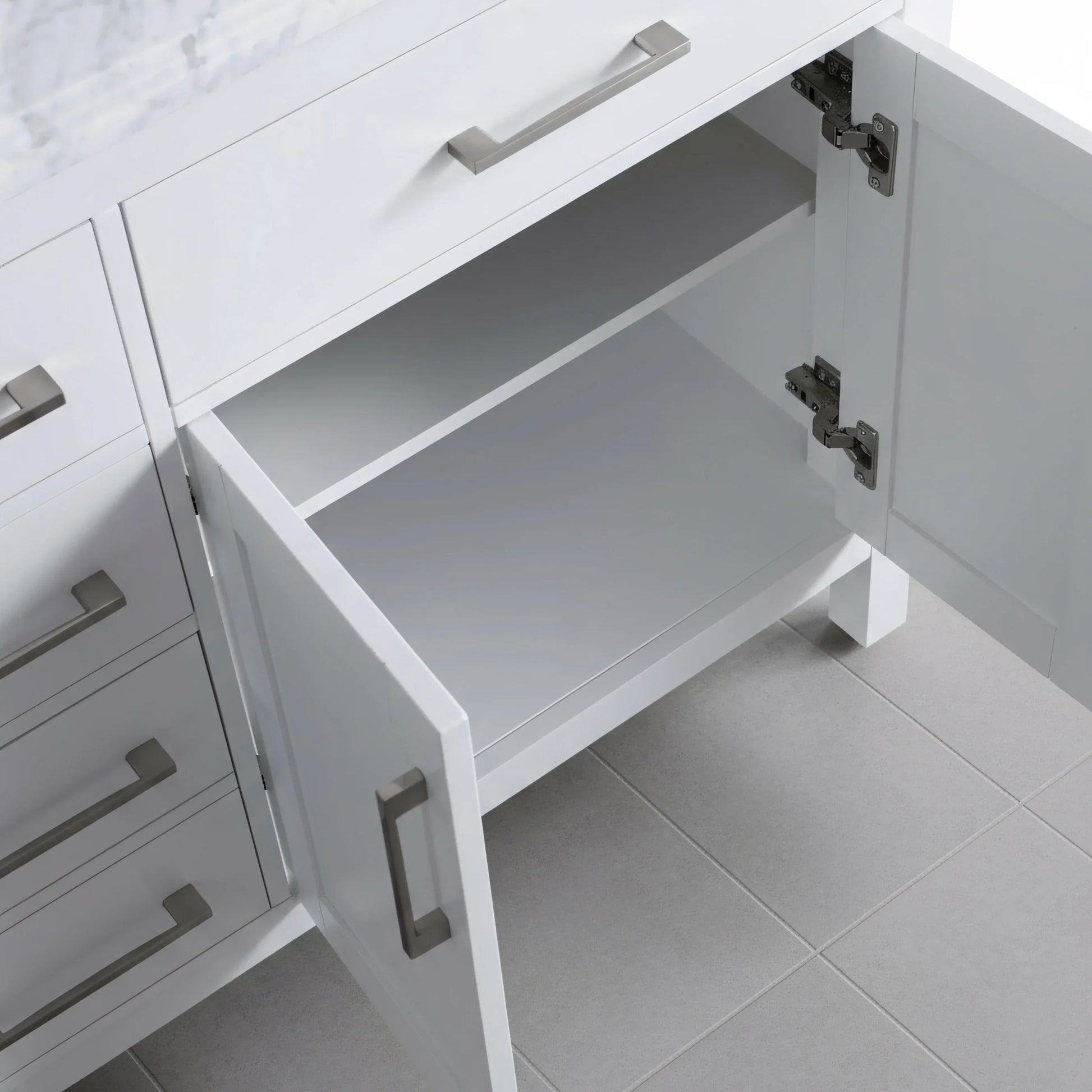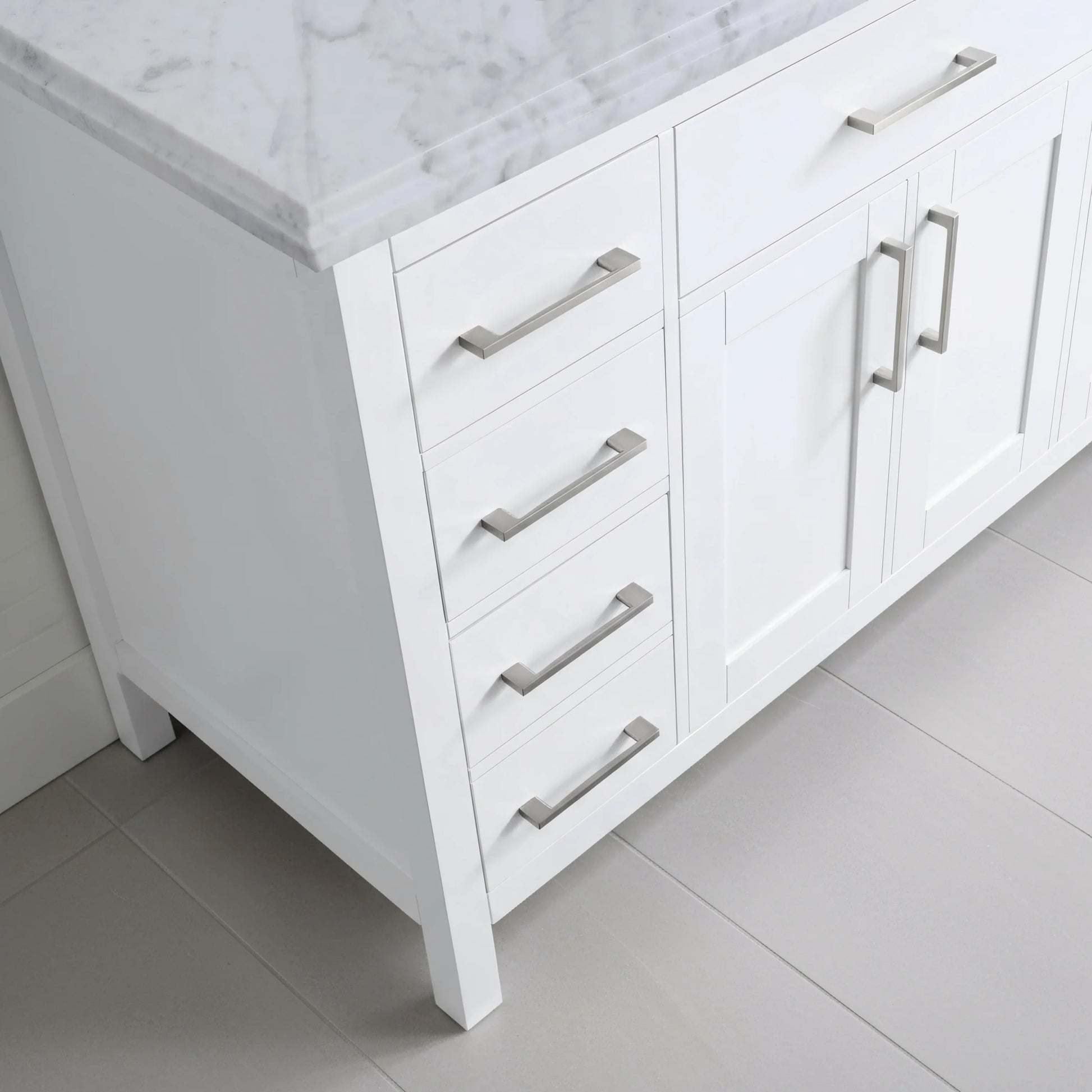 Mella features a solid-hardwood construction, MDF side panels and drawers with soft closing mechanisms for the sheer simplicity of use. It's meticulously chosen white Carrera Marble top demonstrates excellence in quality and craftsmanship and comes polished for an enhanced appearance. Known for simplicity, the Golden Elite Carmela collection comes fully equipped with a pre-mounted CUPC certified under-mount porcelain sink, 4" high matching Marble backsplash, pre-drilled for Mono-faucet, adjustable feet and pop-up drain.