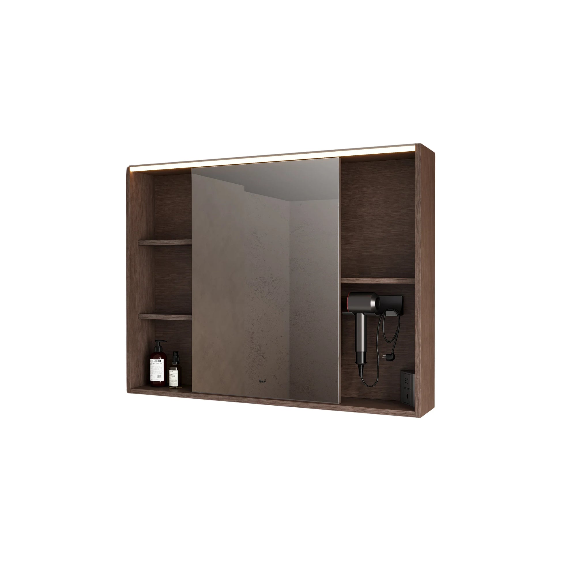 Elevate your bathroom with this stunning 38" LED Mirror Cabinet in a rich Brown Oak finish from the Sanora Collection. This wall-mounted medicine cabinet combines sophisticated design with practical functionality, featuring a central sliding mirror flanked by open shelving compartments for easy access to your everyday essentials.