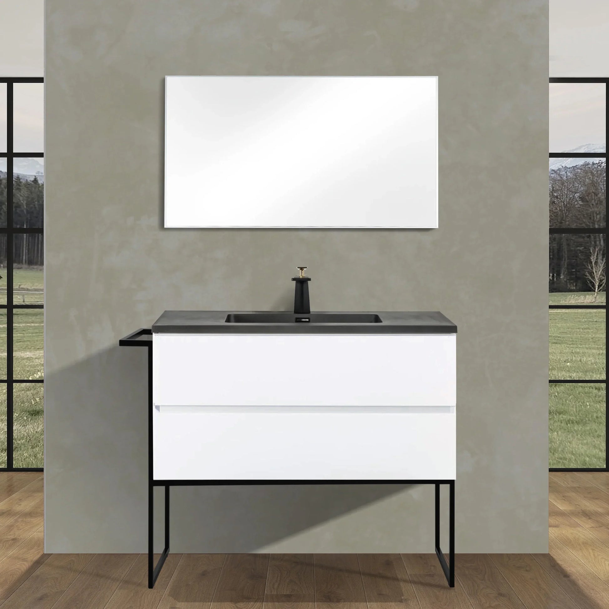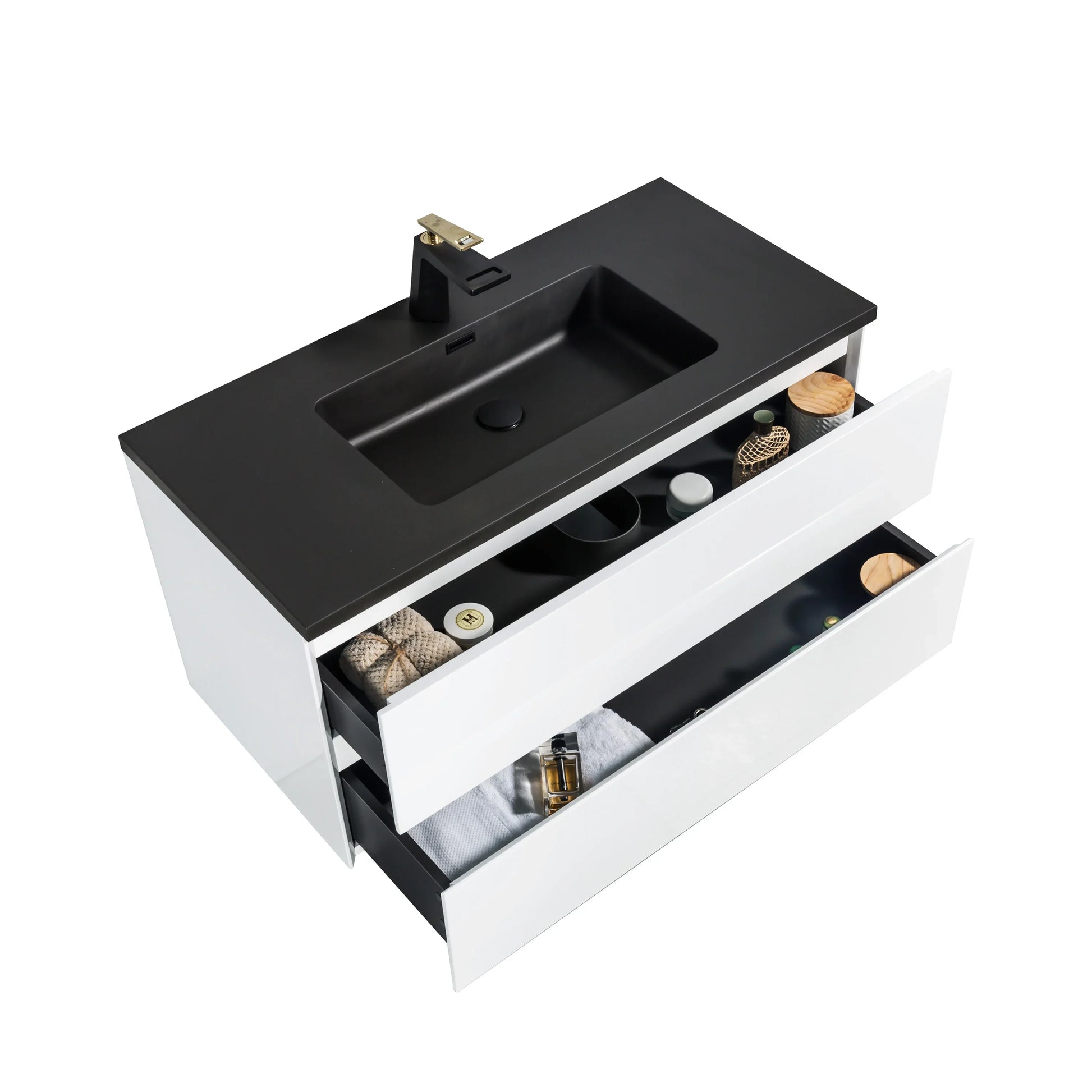 Elevate your bathroom with striking modern contrast. This 40" wall-mounted vanity from the Edge Collection combines a sleek high-gloss white cabinet with a sophisticated matte black engineered quartz countertop, creating a bold contemporary statement.