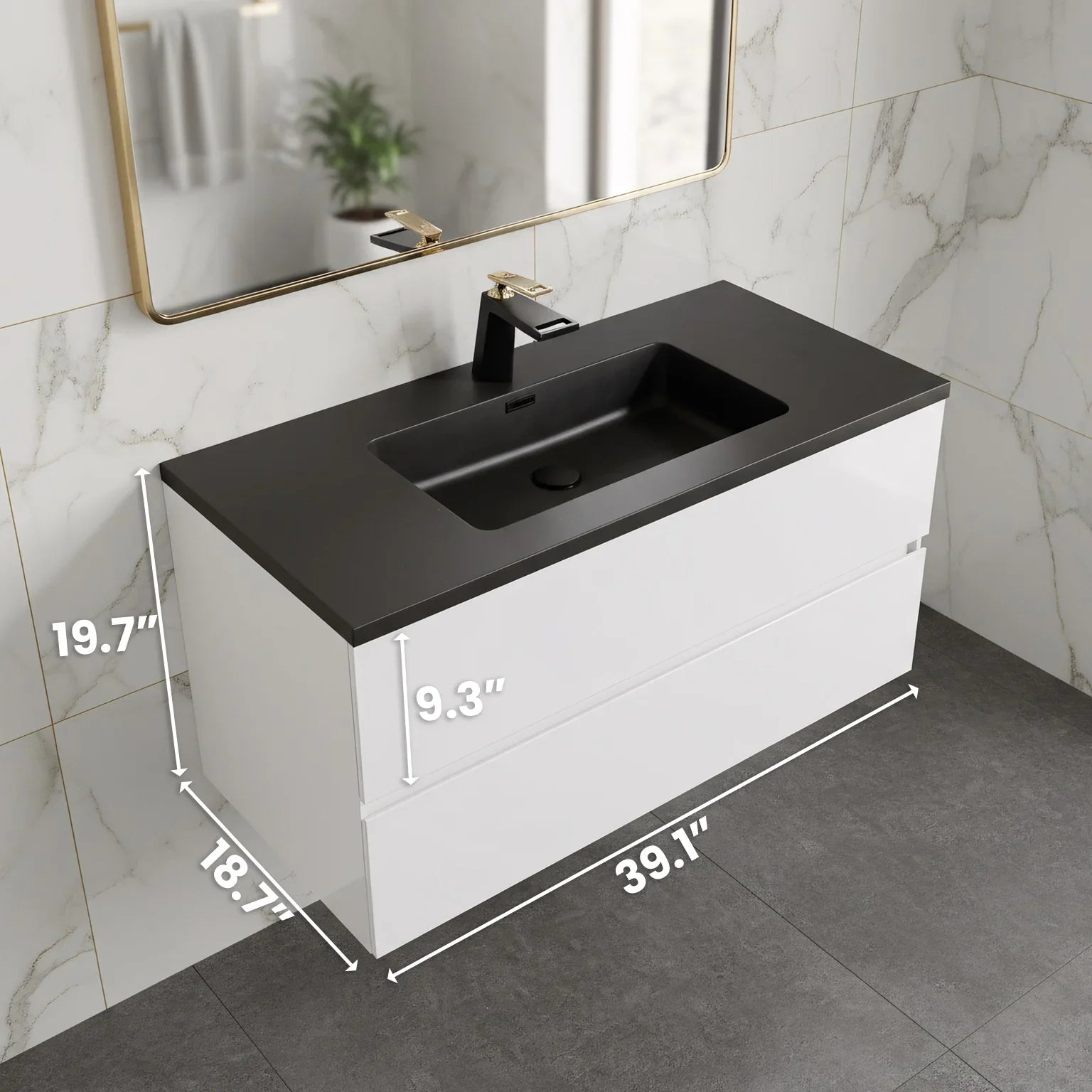 40" White Wall-Mounted Single Sink Bathroom Vanity with Black Engineered Quartz Countertop