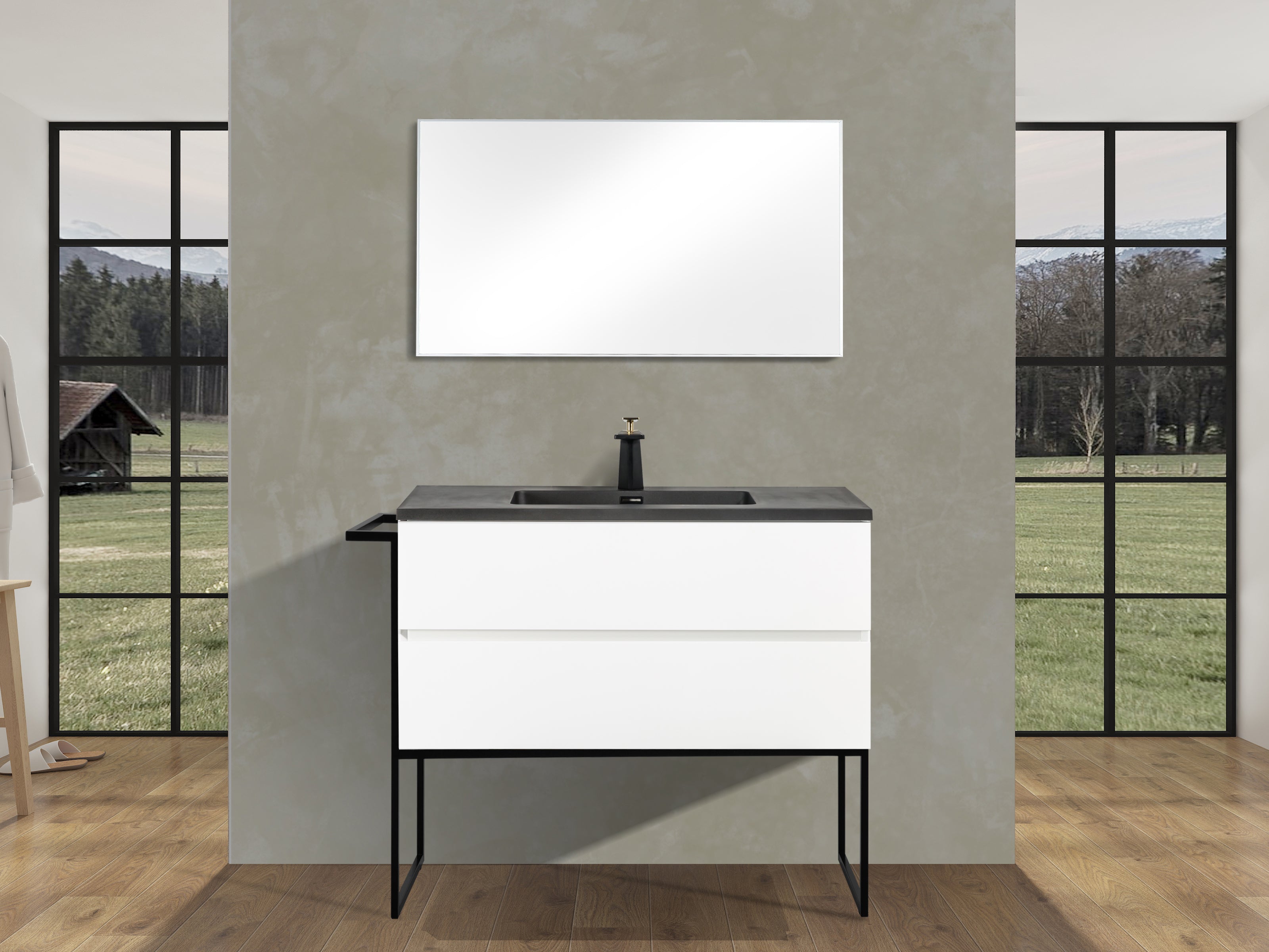 Create sleek minimalism with this 40″ wall-mounted vanity in high-gloss white, topped with a matte black engineered quartz countertop for striking contrast.