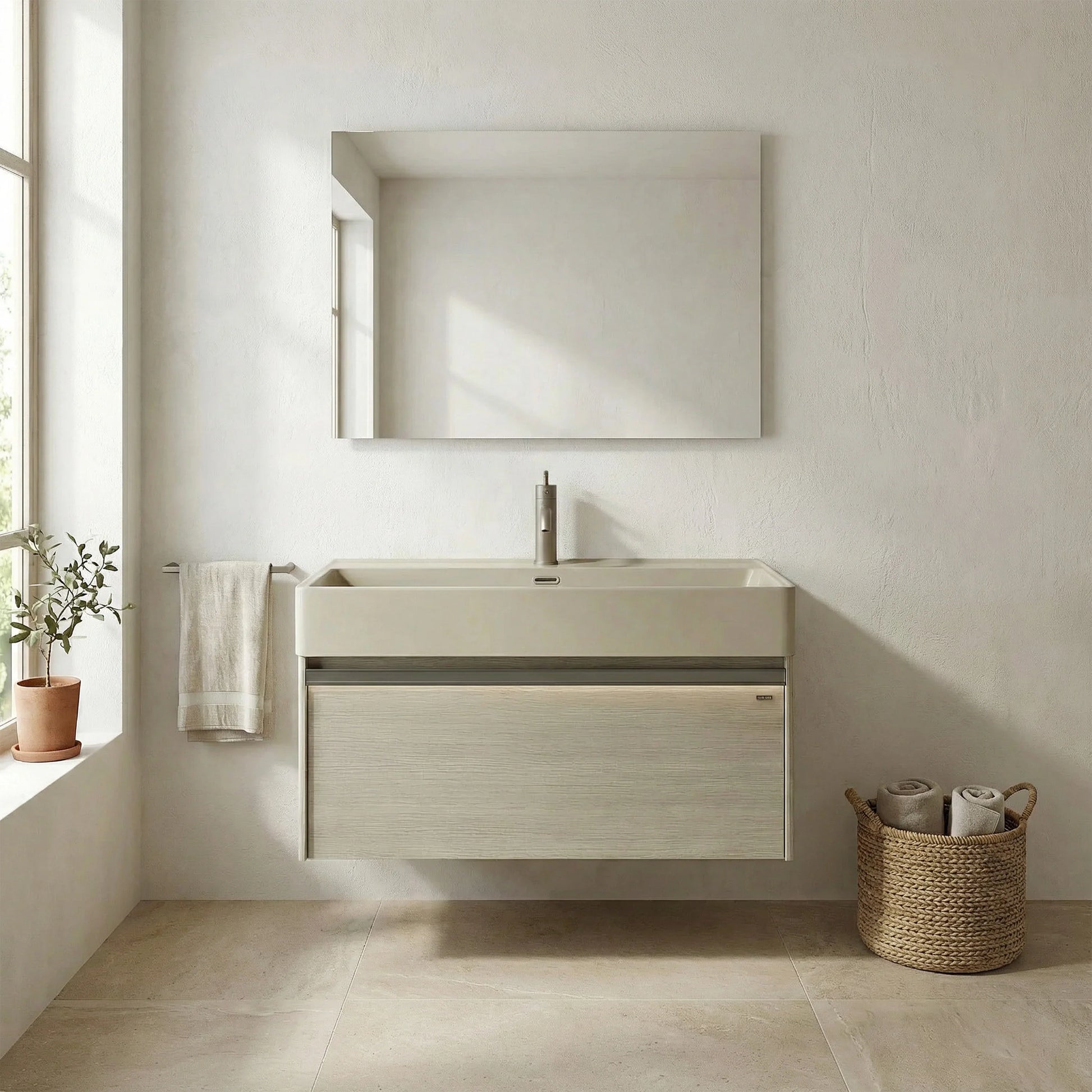 Complementing this is the integrated sink, which merges seamlessly with the countertop for a sleek, unified appearance. This collection is perfect for those who appreciate the beauty of simplicity and the functionality of thoughtful design, turning any bathroom into a modern sanctuary.