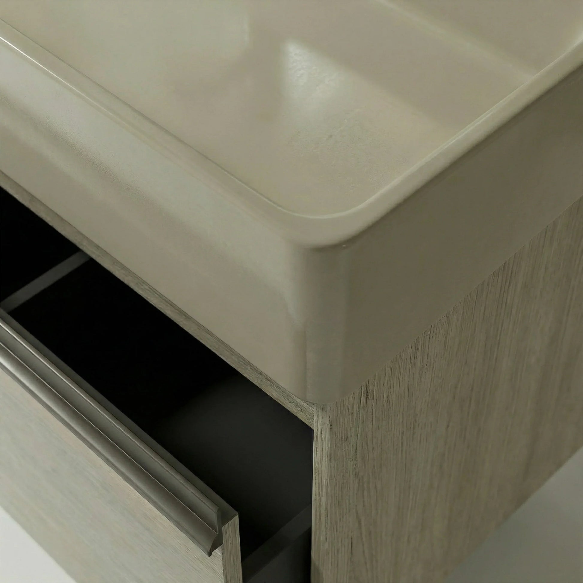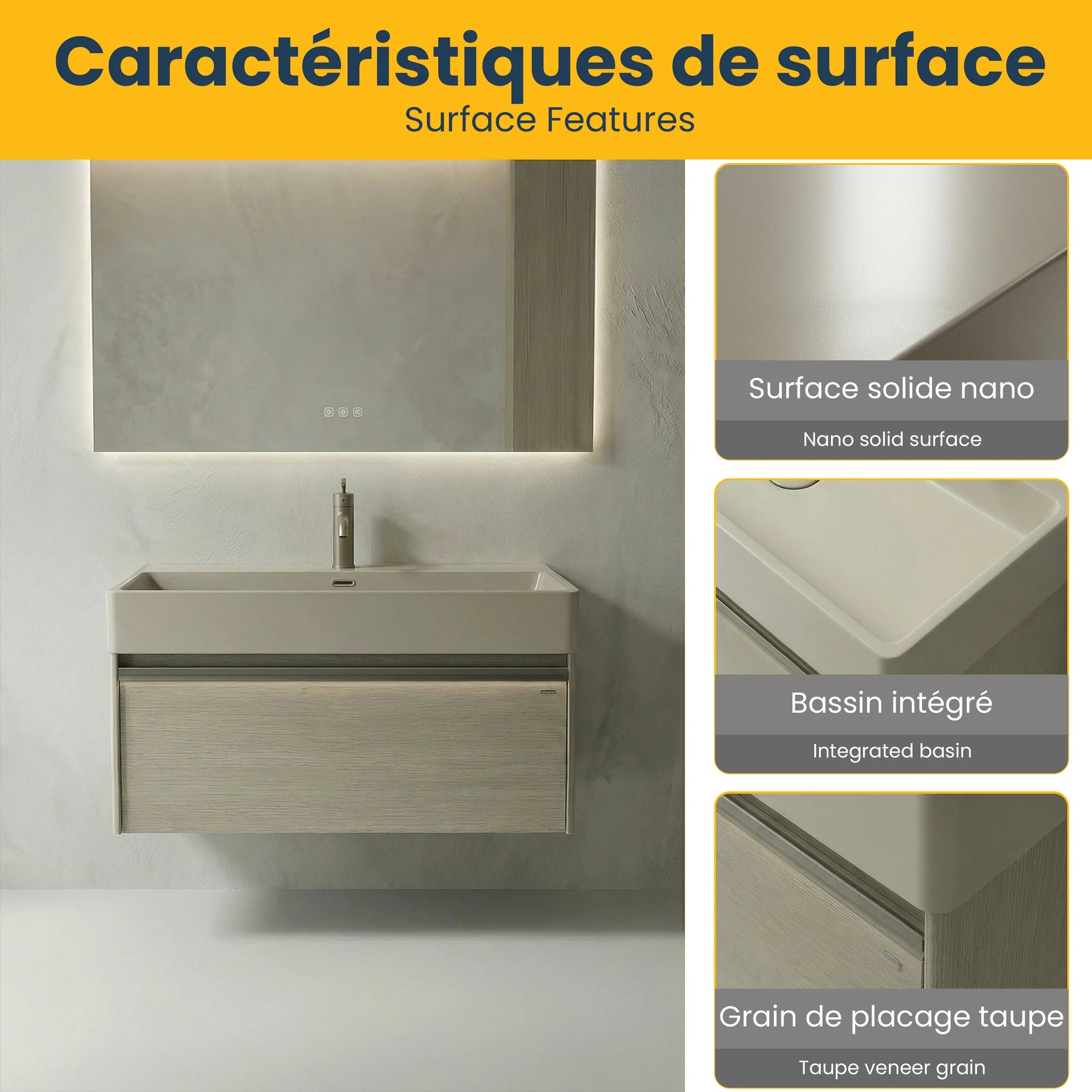 The true artistry of this vanity lies in its unique Light Taupe Nano Solid Surface countertop. This design not only adds visual interest but also offers practical benefits, providing more surface area in a stylish package.