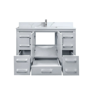 Each vanity comes fully loaded with a pre-mounted, CUPC-certified under-mount porcelain sink, a 4" high matching marble backsplash, pre-drilled mono-faucet holes, adjustable feet, and a pop-up drain for easy installation.