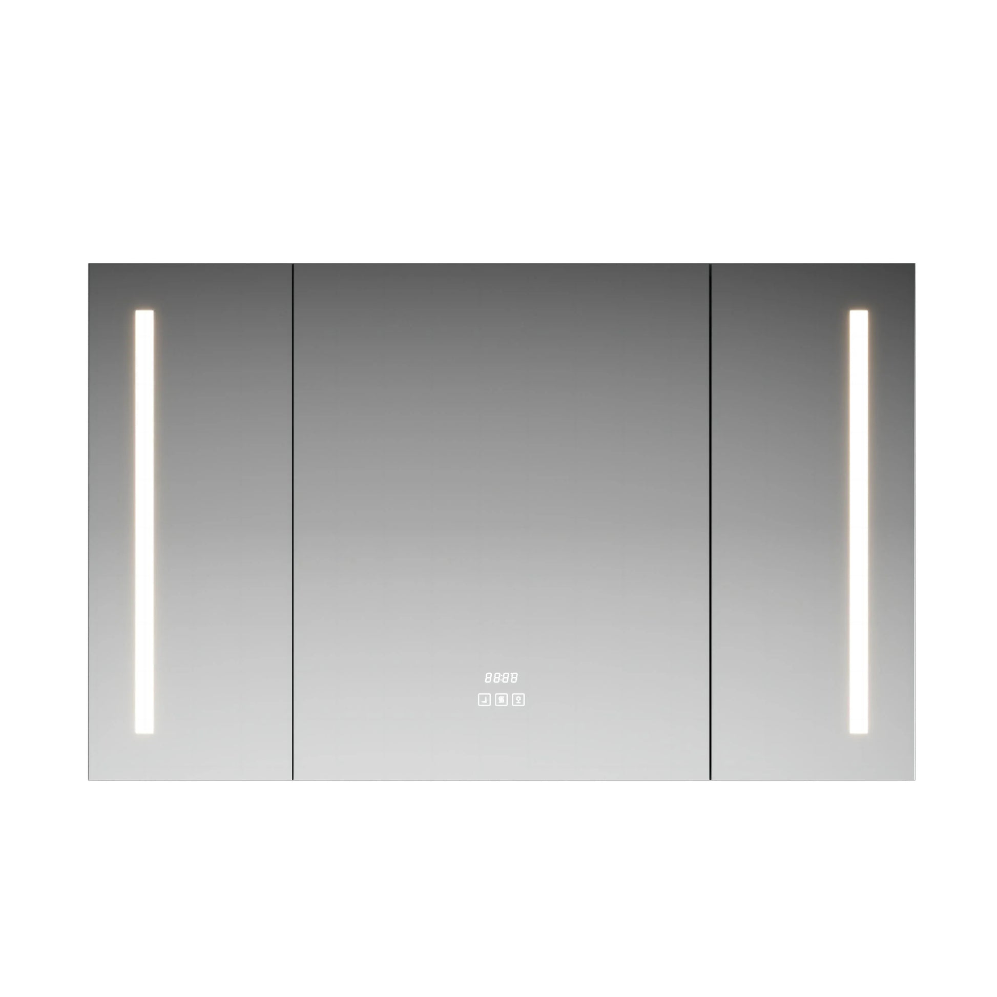 The anti-fog mirror ensures crystal-clear visibility even in steamy bathrooms, while smart technology features include a convenient digital time display and intuitive touch sensor controls centered on the middle panel. Built-in electrical outlets and USB ports make charging devices effortless, keeping your countertops clutter-free.
