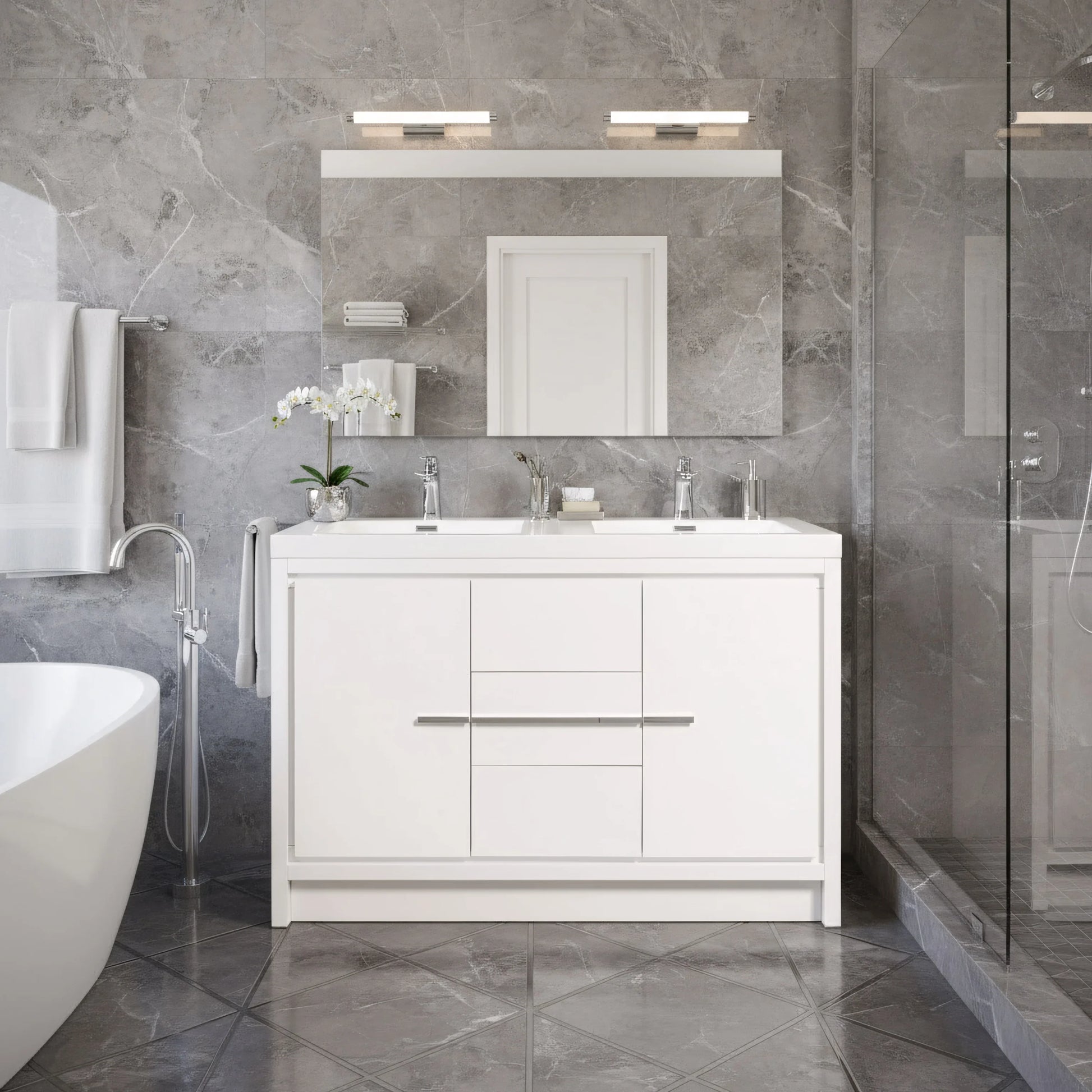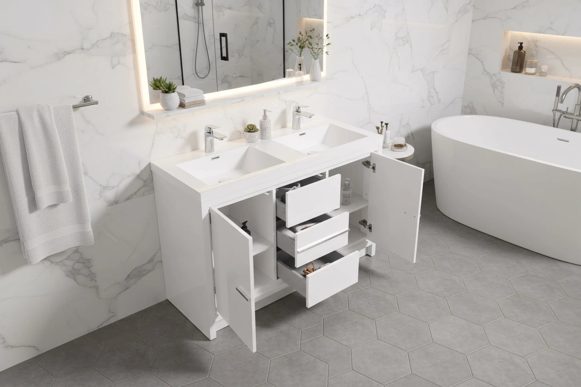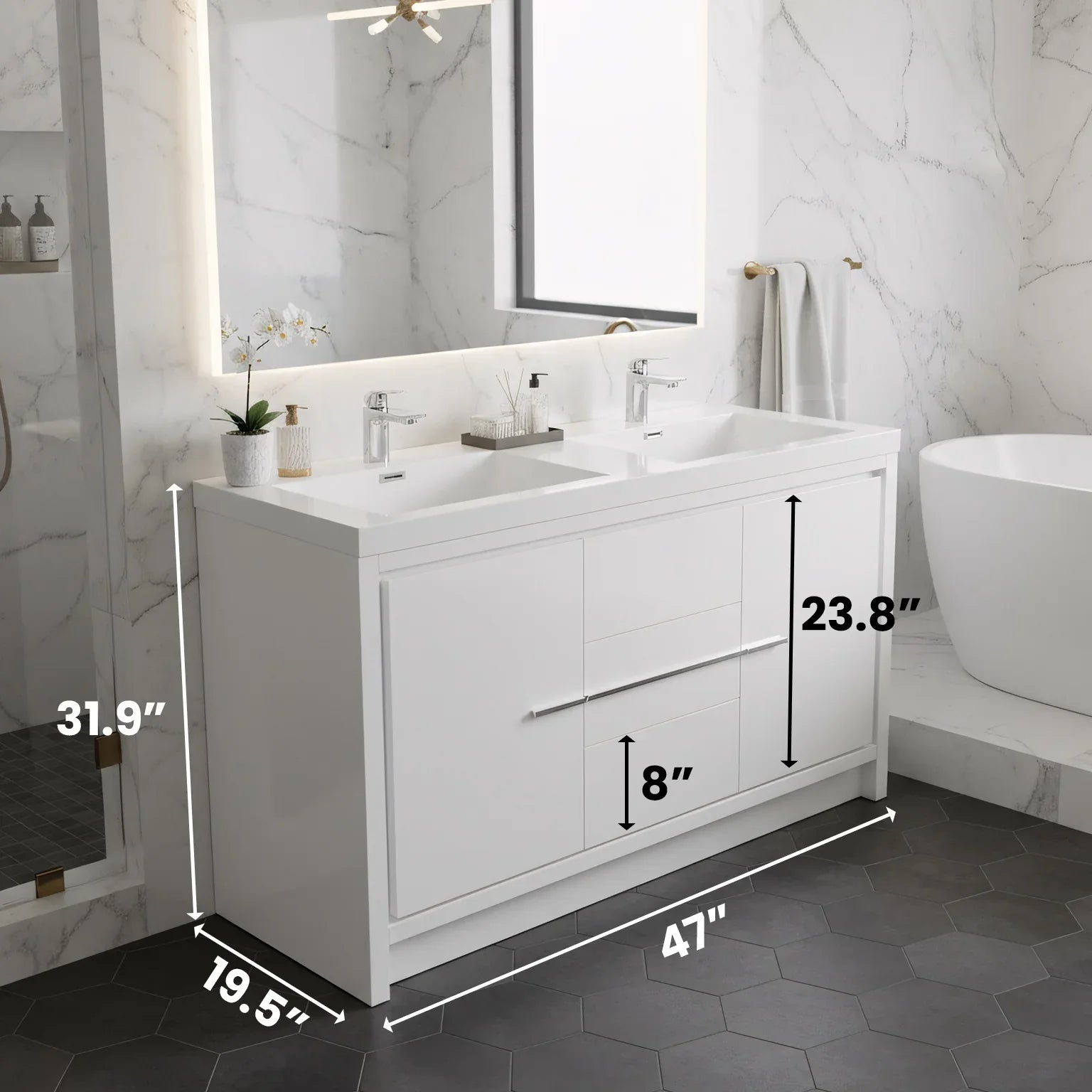 48" Glossy White Freestanding Double Sink Bathroom Vanity with White Polymarble Countertop