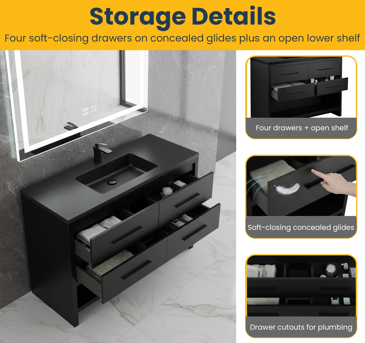 A new collection of Golden Elite freestanding vanities, Fiory adds a contemporary look to any bathroom. Designed to provide you with great storage space, the large vanity cabinet has both open and concealed storage to optimize organization. Soft-closing vanity drawers provide a quiet and elegant experience. The drawers are specifically designed to accommodate plumbing and give you the most amount of storage space out of your vanity.