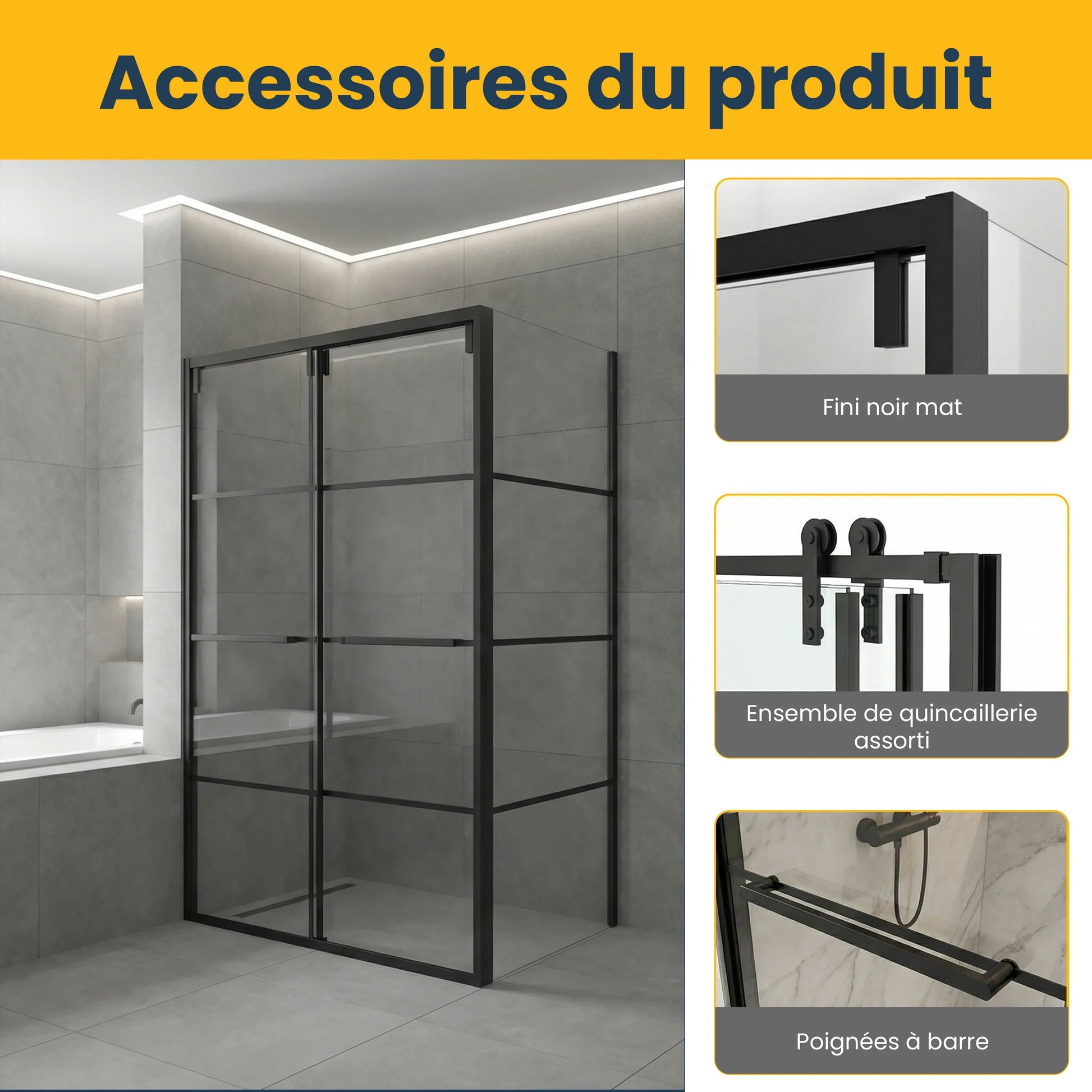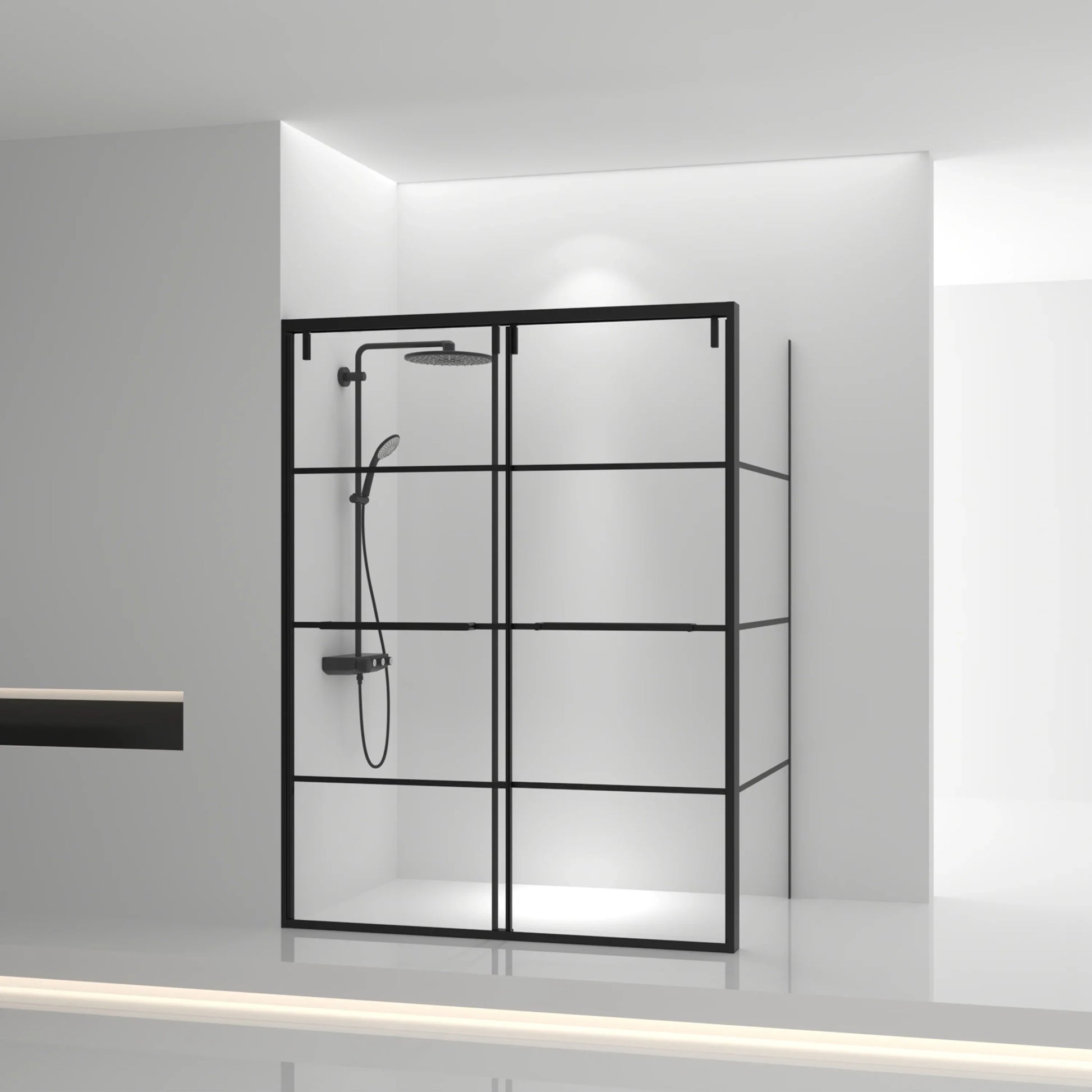 This 48" x 79" framed sliding shower door with a 32" side panel delivers that coveted industrial-luxe look Montreal homeowners love. The Tina Collection's bold matte black linear grid framework transforms any corner shower into a design statement.