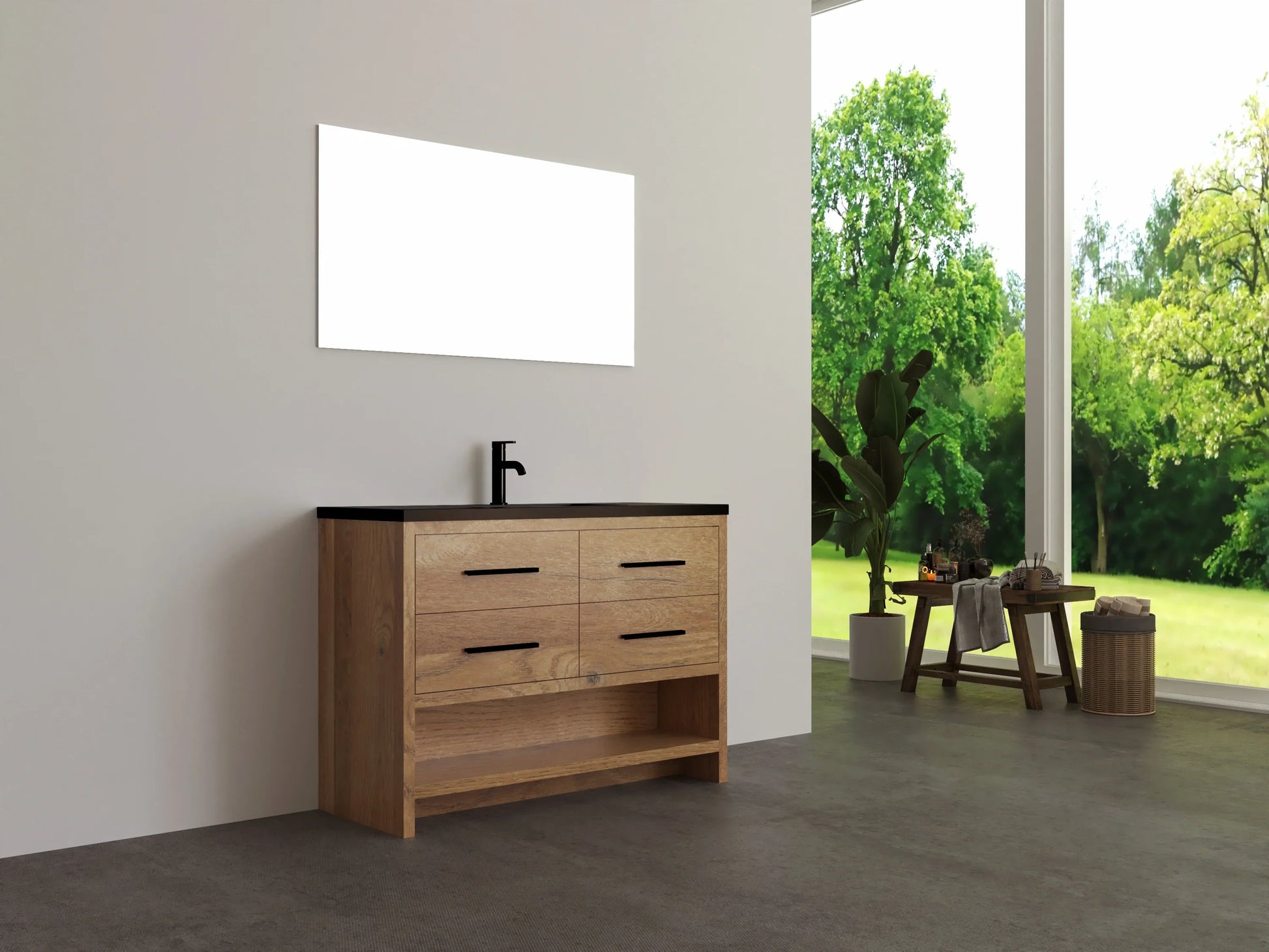 48" Rough Oak Freestanding Bathroom Vanity with Black Engineered Quartz Countertop
