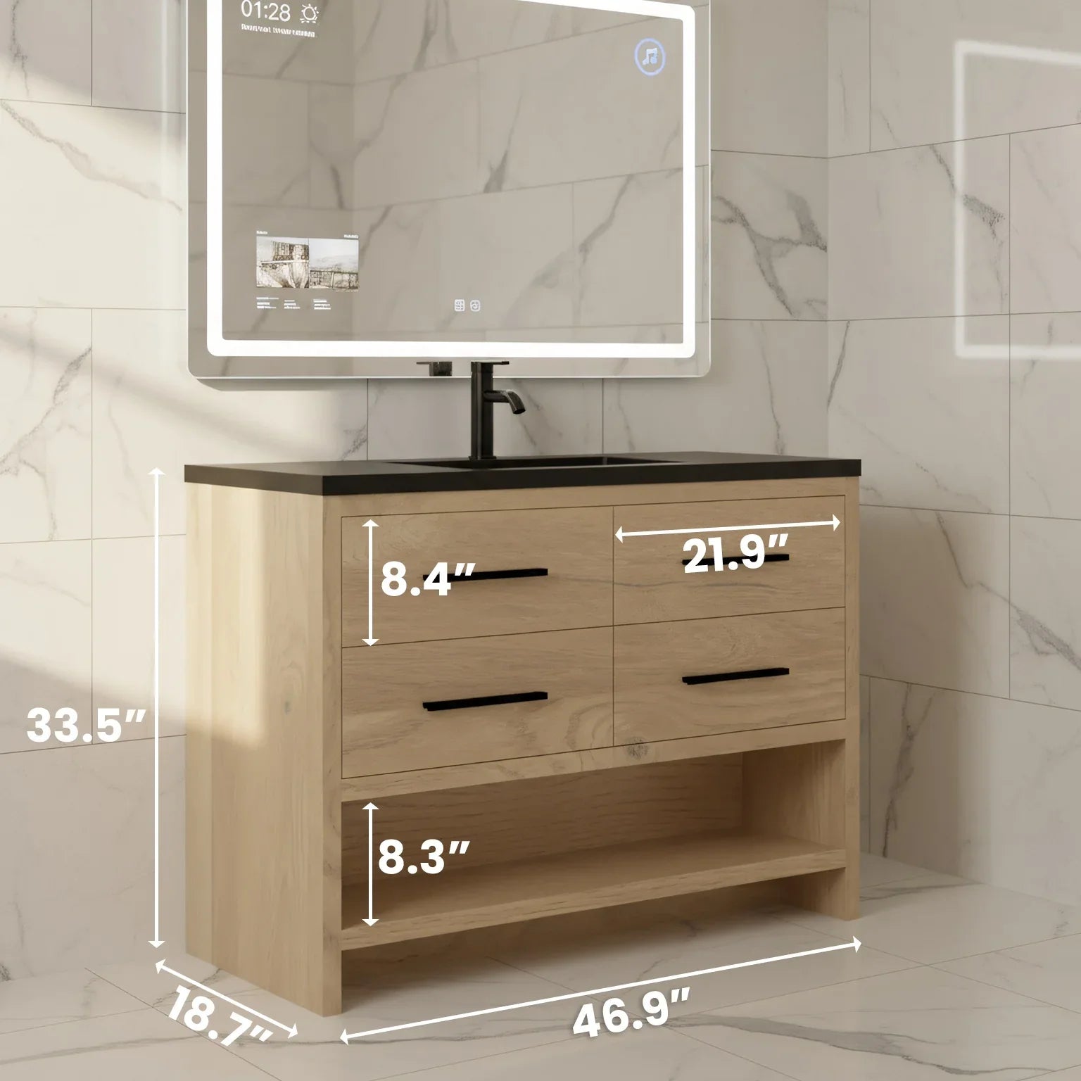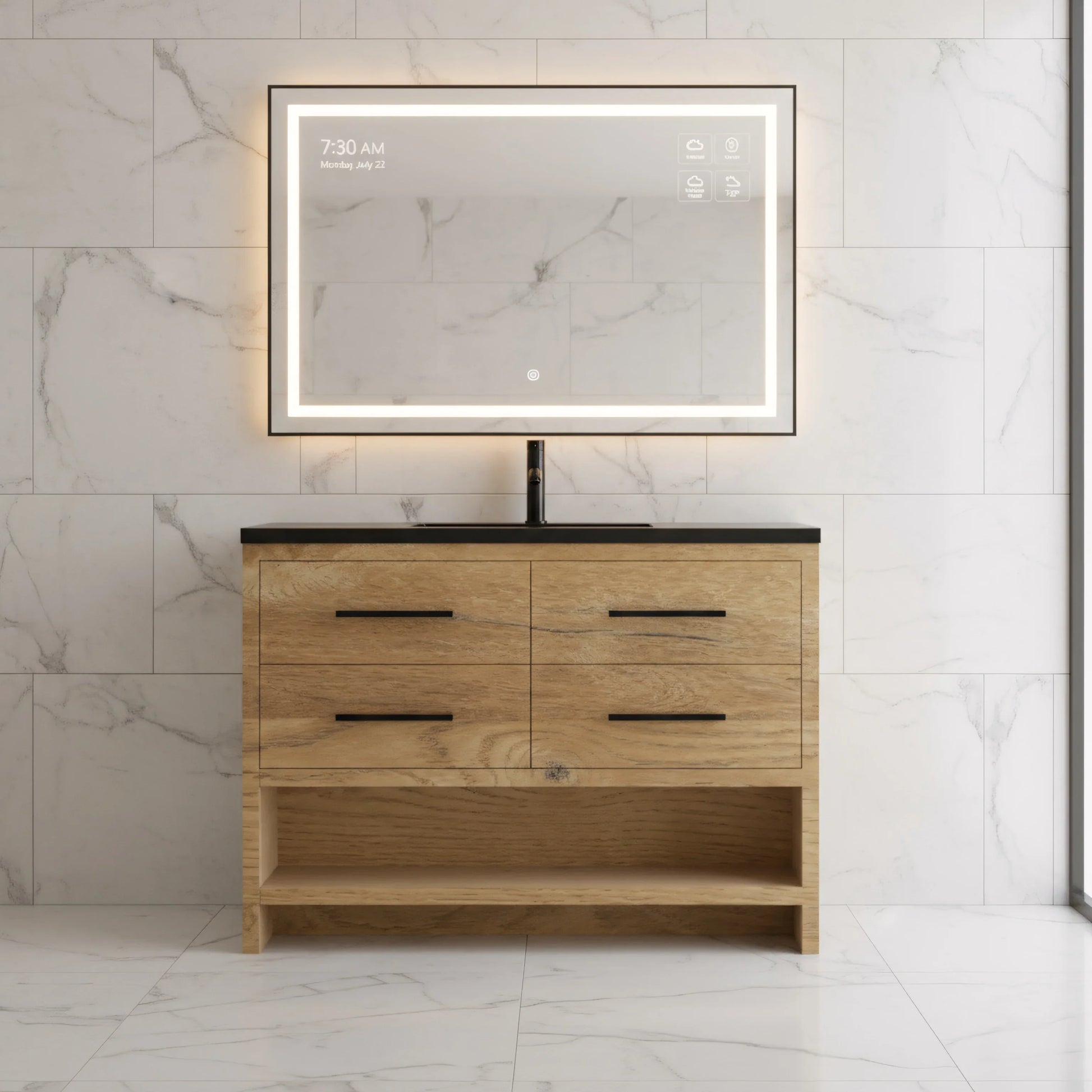 The Fiory vanity features an elegant melamine rough oak finish. It's simple, minimalistic look is sure to modernize and liven up any bathroom design, whether dark, light or in between, and contrasts beautifully with any ceramic tiling style. Its Countertop is a meticulously chosen black engineered quartz top that demonstrates excellence in quality and craftsmanship and comes polished for an enhanced appearance.