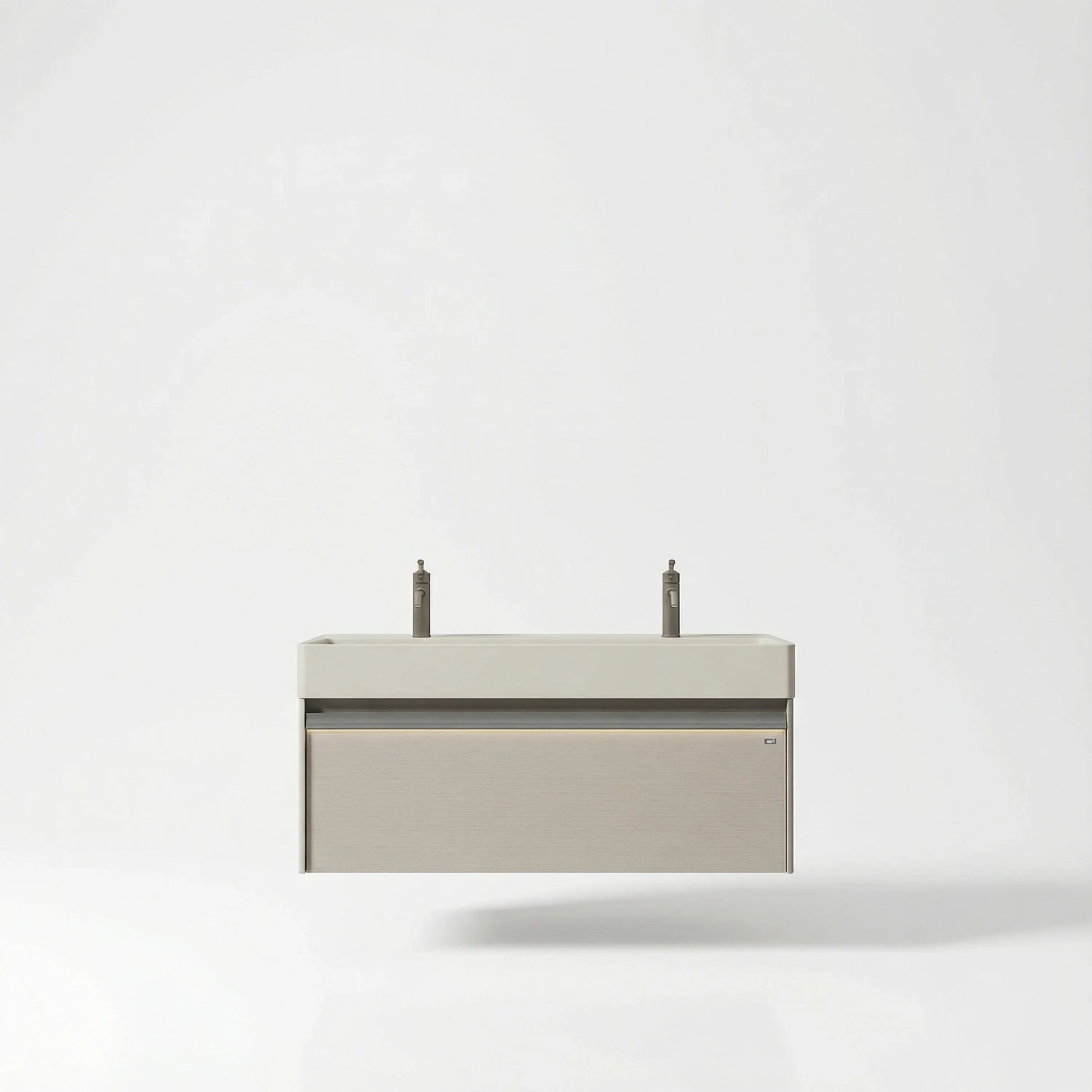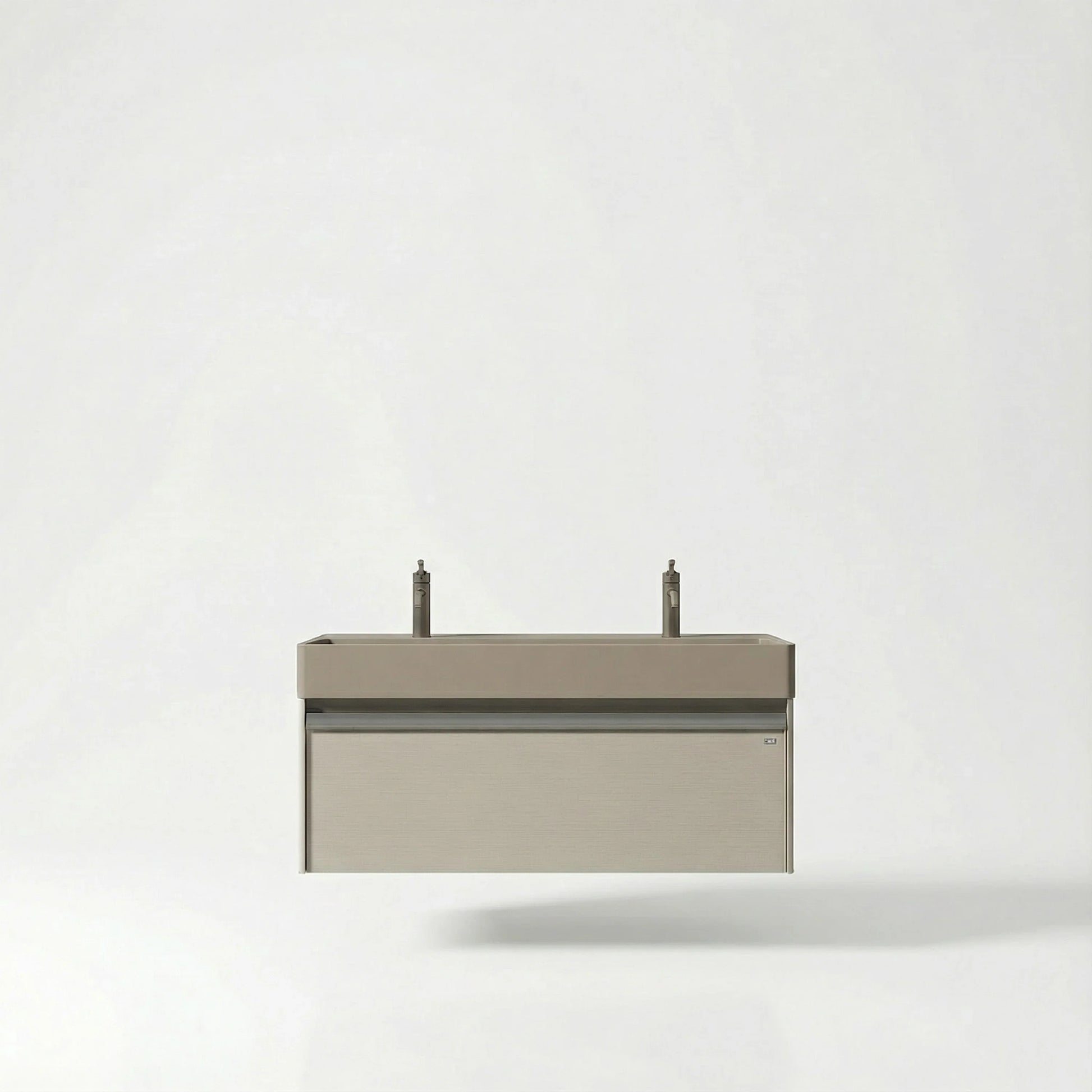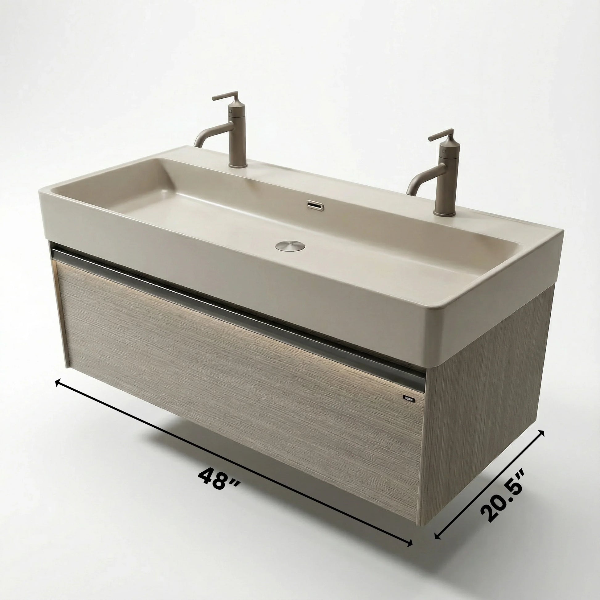 Elevate your bathroom with modern minimalism and innovative design in this striking 48" Taupe wall-hung vanity from Hillcrest Collection, made from high-quality taupe plywood and featuring concealed, soft-close drawer slides of German design. It is equipped with a single sink and open 2 single Hole without faucet, retractable gunmetal-colored brass drain, adding a touch of understated elegance.