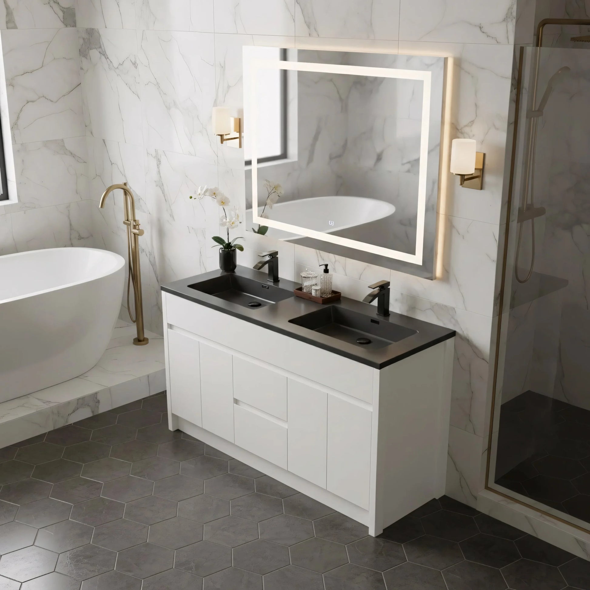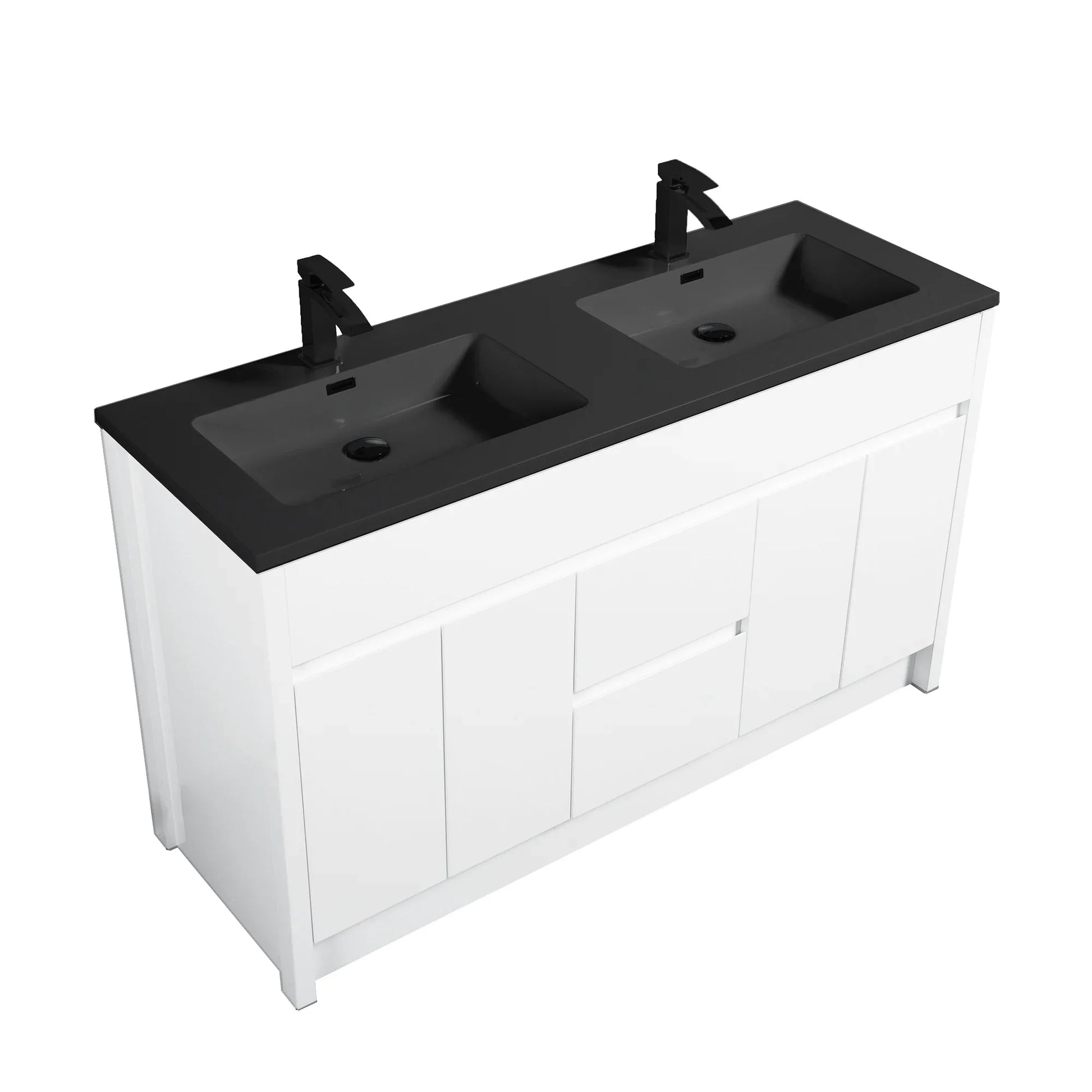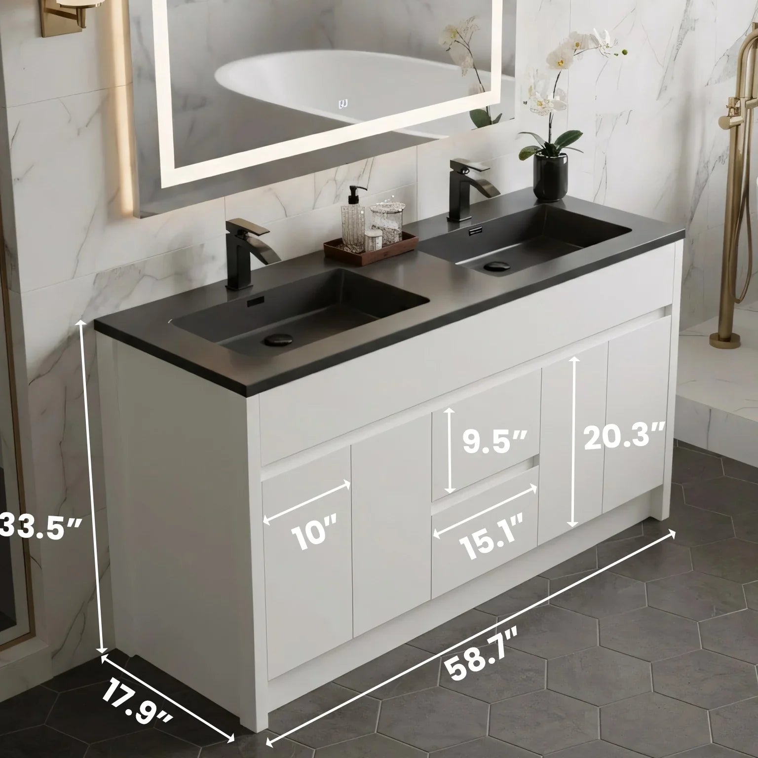 60" Matte White Freestanding Double Sink Bathroom Vanity with Black Engineered Quartz Countertop