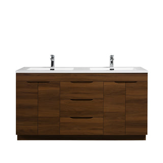 60" Walnut Freestanding Double Sink Bathroom Vanity with White Polymarble Countertop