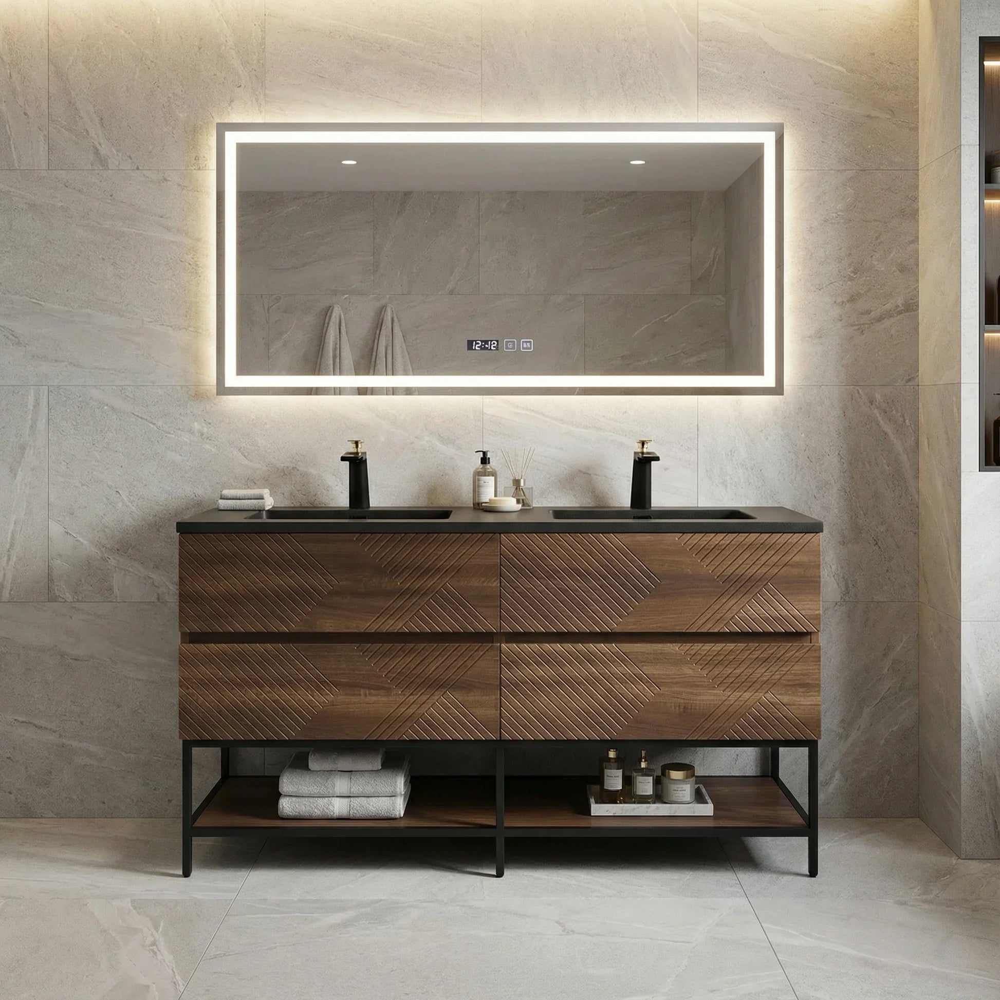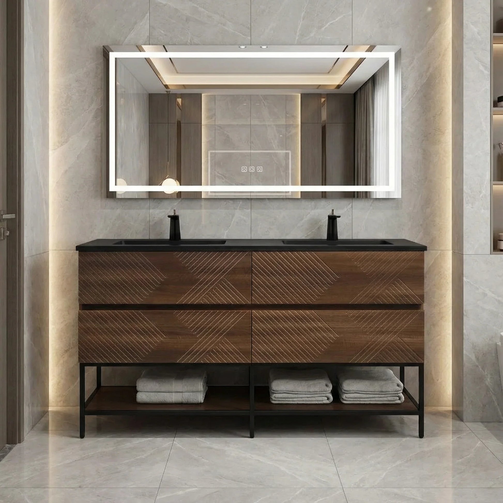 Define bold minimalism with this 60″ wall-mounted double sink vanity in a rich walnut finish, topped with a stunning black engineered quartz countertop. Perfectly suited for modern bathrooms seeking warmth, contrast, and functional elegance.