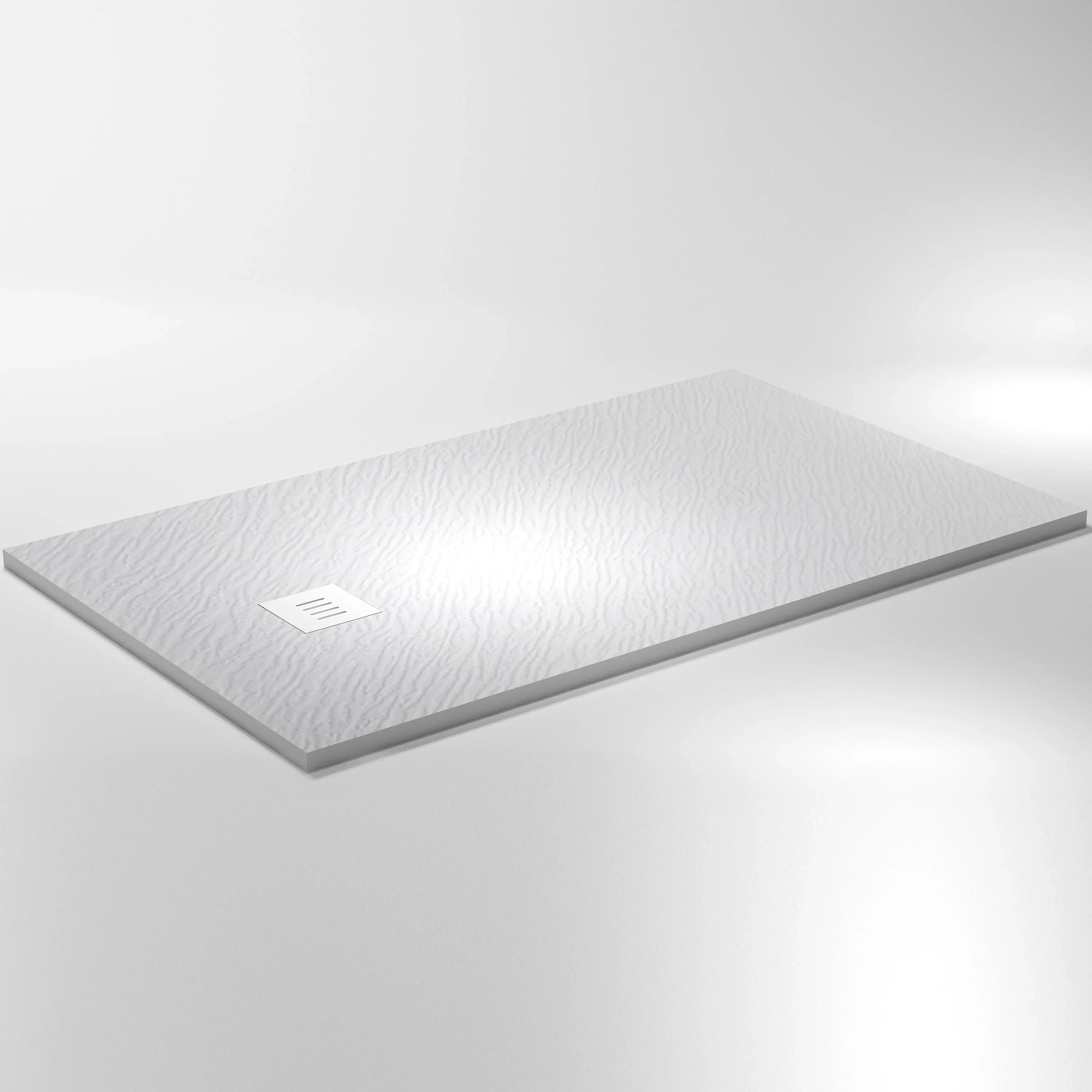 It is finished with a matte white coating that resists stains and scratches, keeping it looking clean and new. Additionally, the base has a linear drain with an acrylic cover for easy installation.