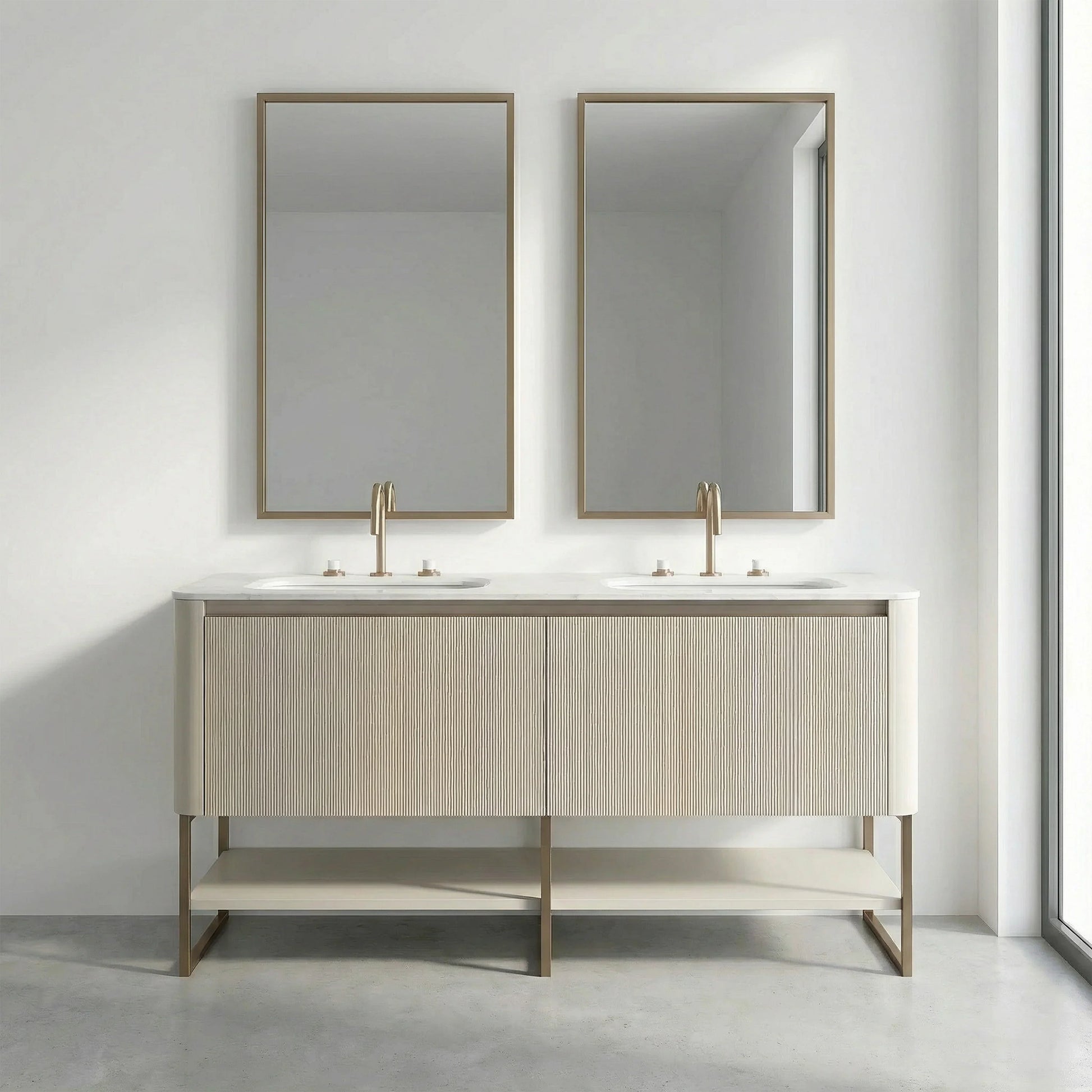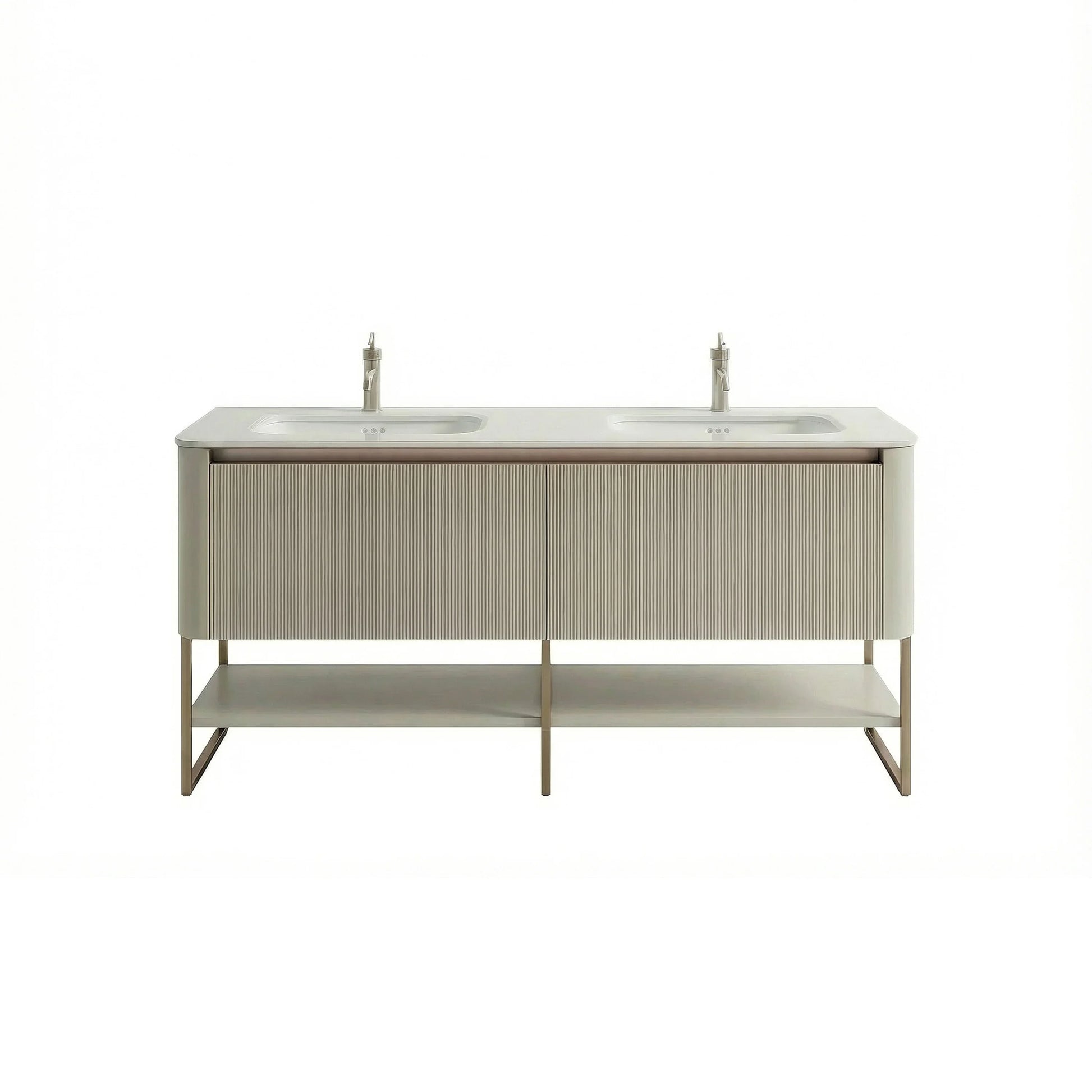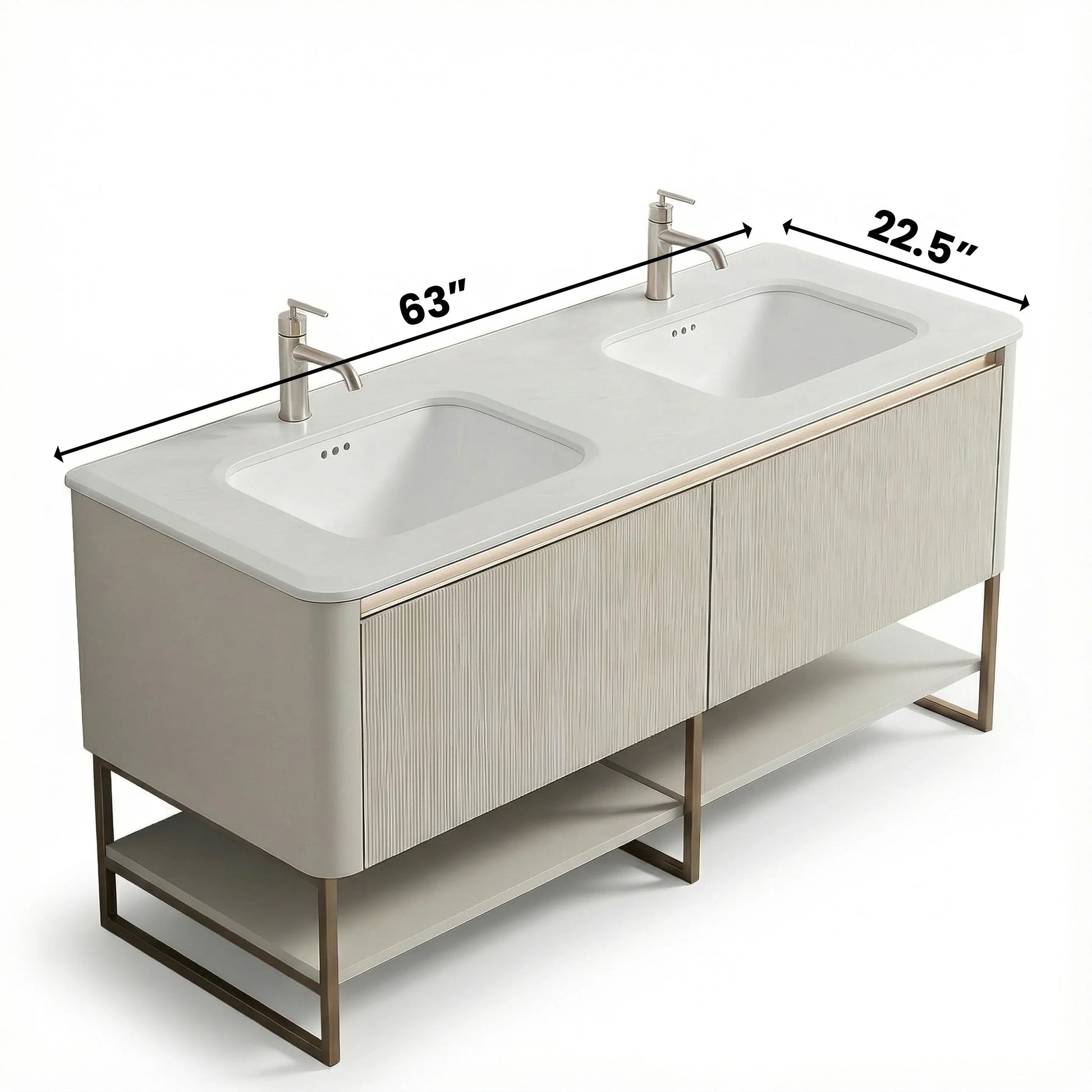 Transform your bathroom with Kari Collection 63 inch wall-hung vanity in an elegant Latte finish exudes a natural warmth and sophistication pinstripes with vertical pattern that complements any bathroom.featuring integrated LED lighting and a luxurious marble countertop. The vanity includes Brushed Gold Brass Pop-up drain, adding just the right amount of edge. This bathroom vanity also includes an additional a Brushed Gold metal frame and Latte fixtures for adding a refined modern touch while offering more storage space and better organization. The open shelving design provides easy access to everyday essentials, keeps the countertop clutter-free, and helps maximize space efficiency—perfect for a clean, functional bathroom setup.