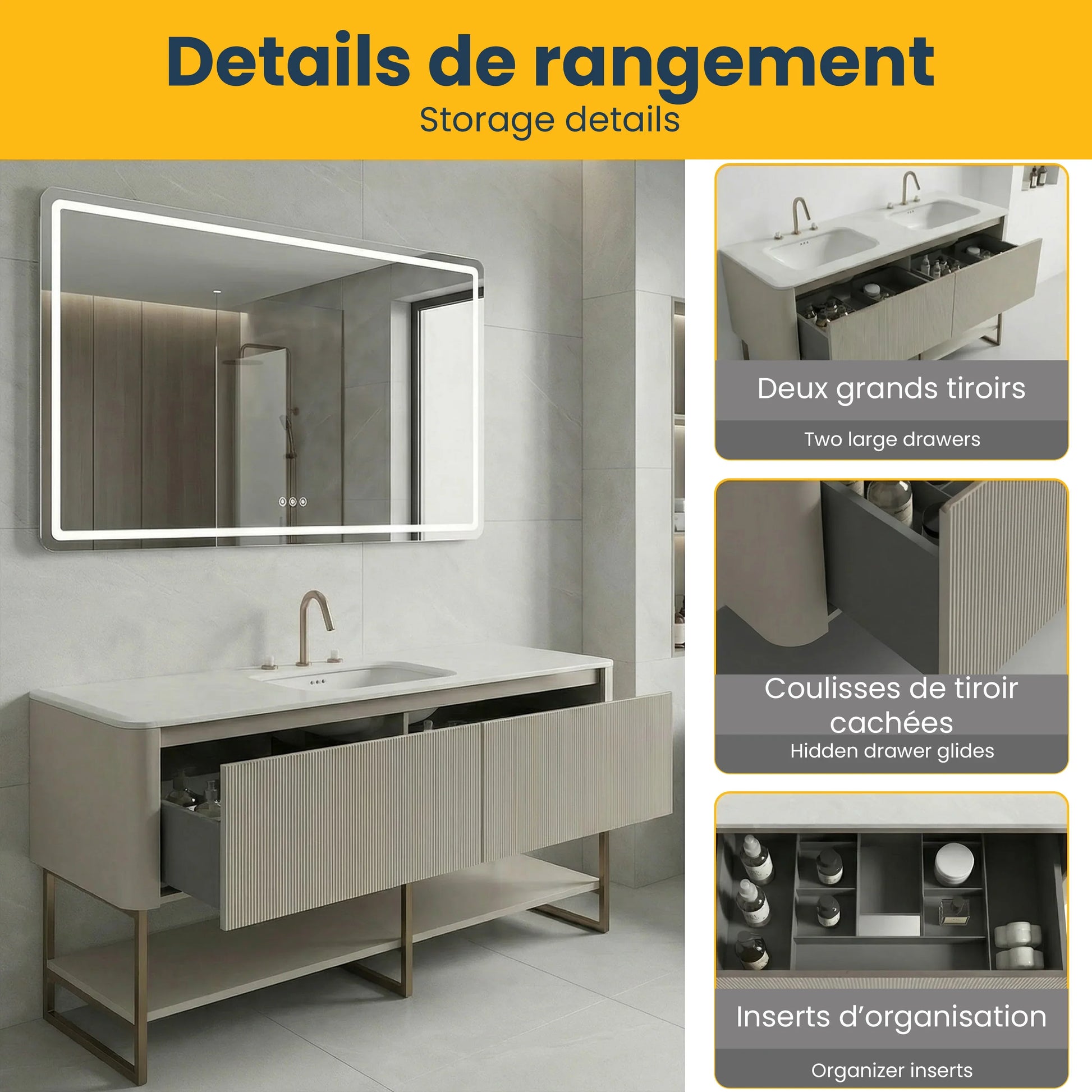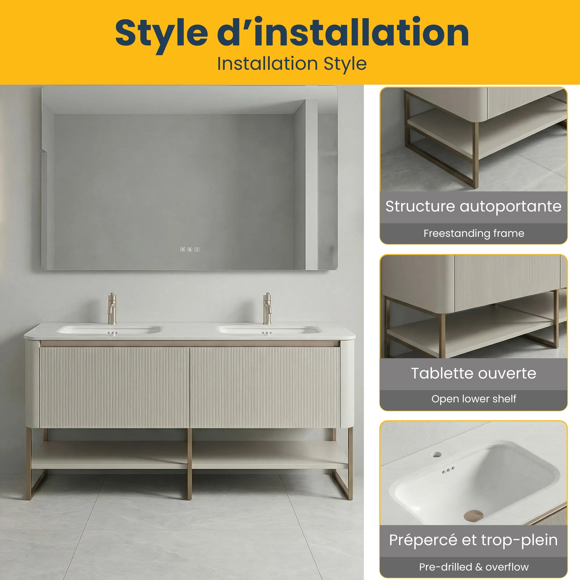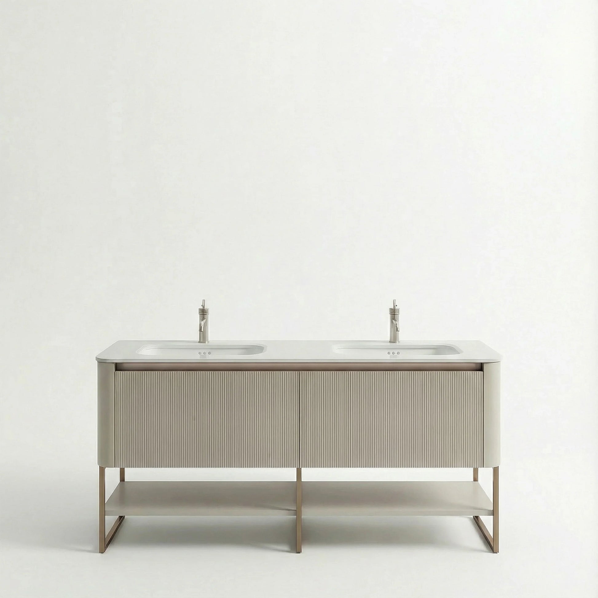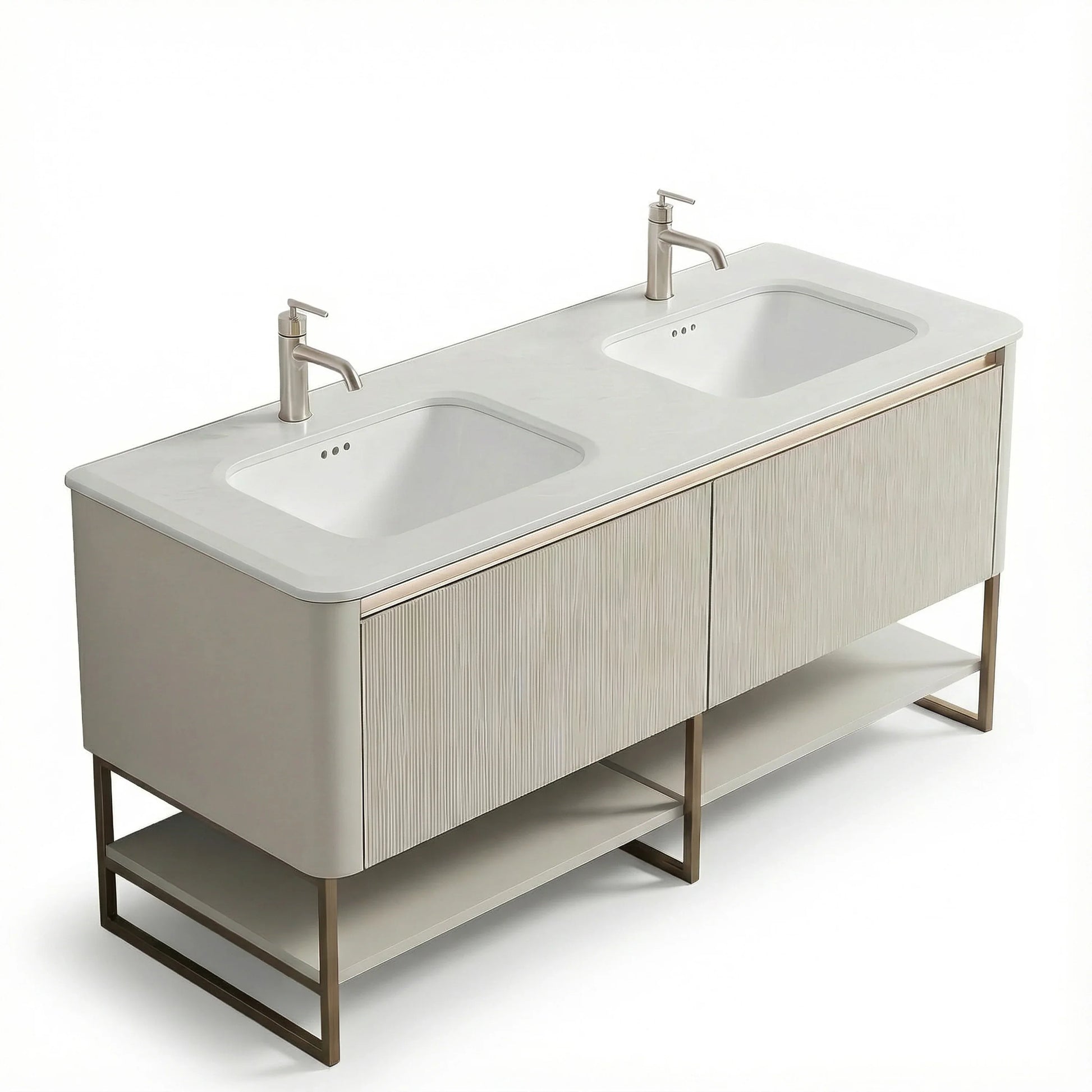 Transform your bathroom with Kari Collection 63 inch wall-hung vanity in an elegant Latte finish exudes a natural warmth and sophistication pinstripes with vertical pattern that complements any bathroom.featuring integrated LED lighting and a luxurious marble countertop. The vanity includes Brushed Gold Brass Pop-up drain, adding just the right amount of edge. This bathroom vanity also includes an additional a Brushed Gold metal frame and Latte fixtures for adding a refined modern touch while offering more storage space and better organization. The open shelving design provides easy access to everyday essentials, keeps the countertop clutter-free, and helps maximize space efficiency—perfect for a clean, functional bathroom setup.
