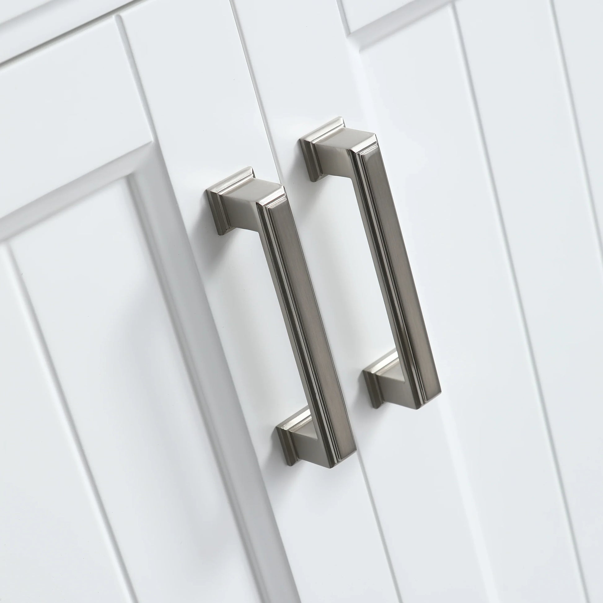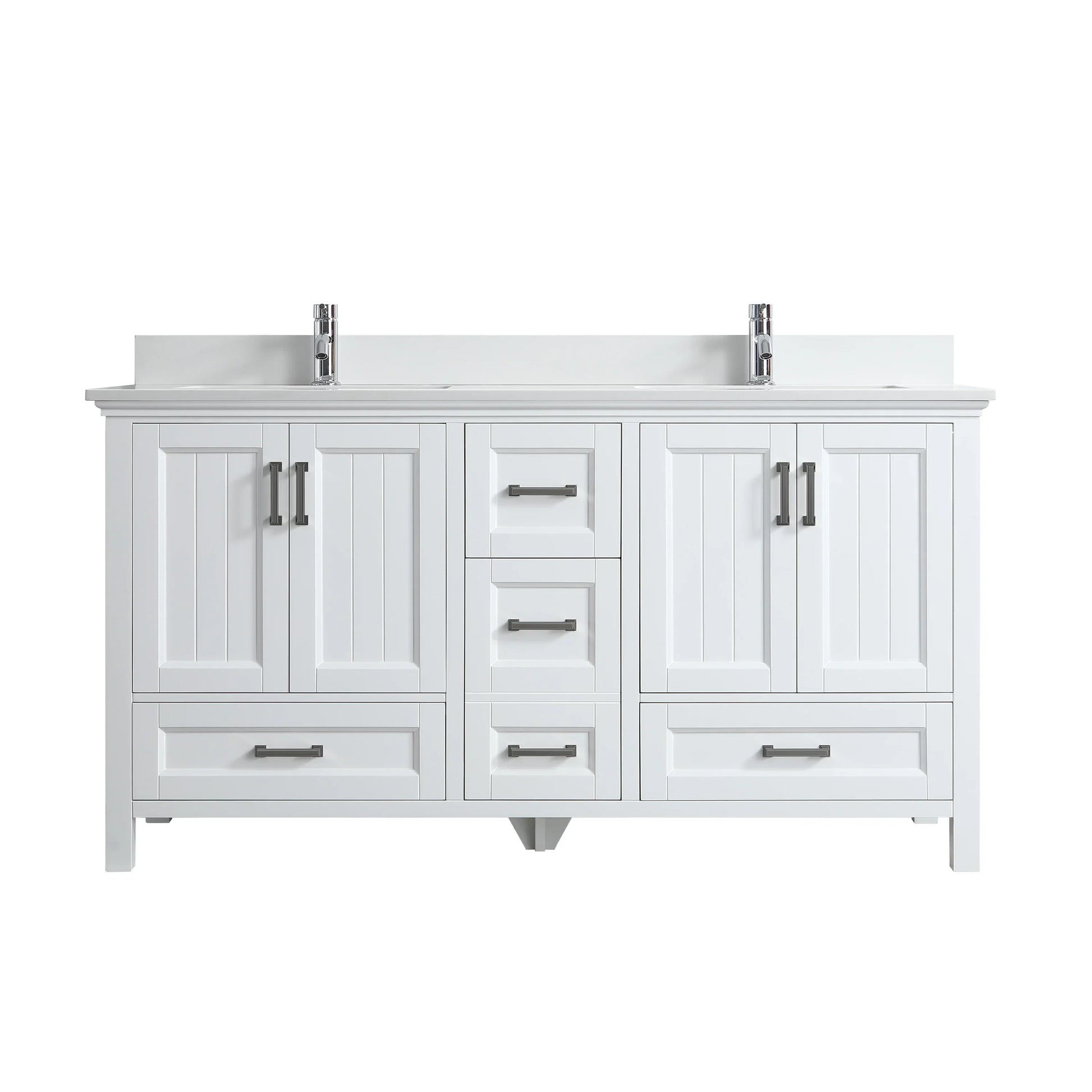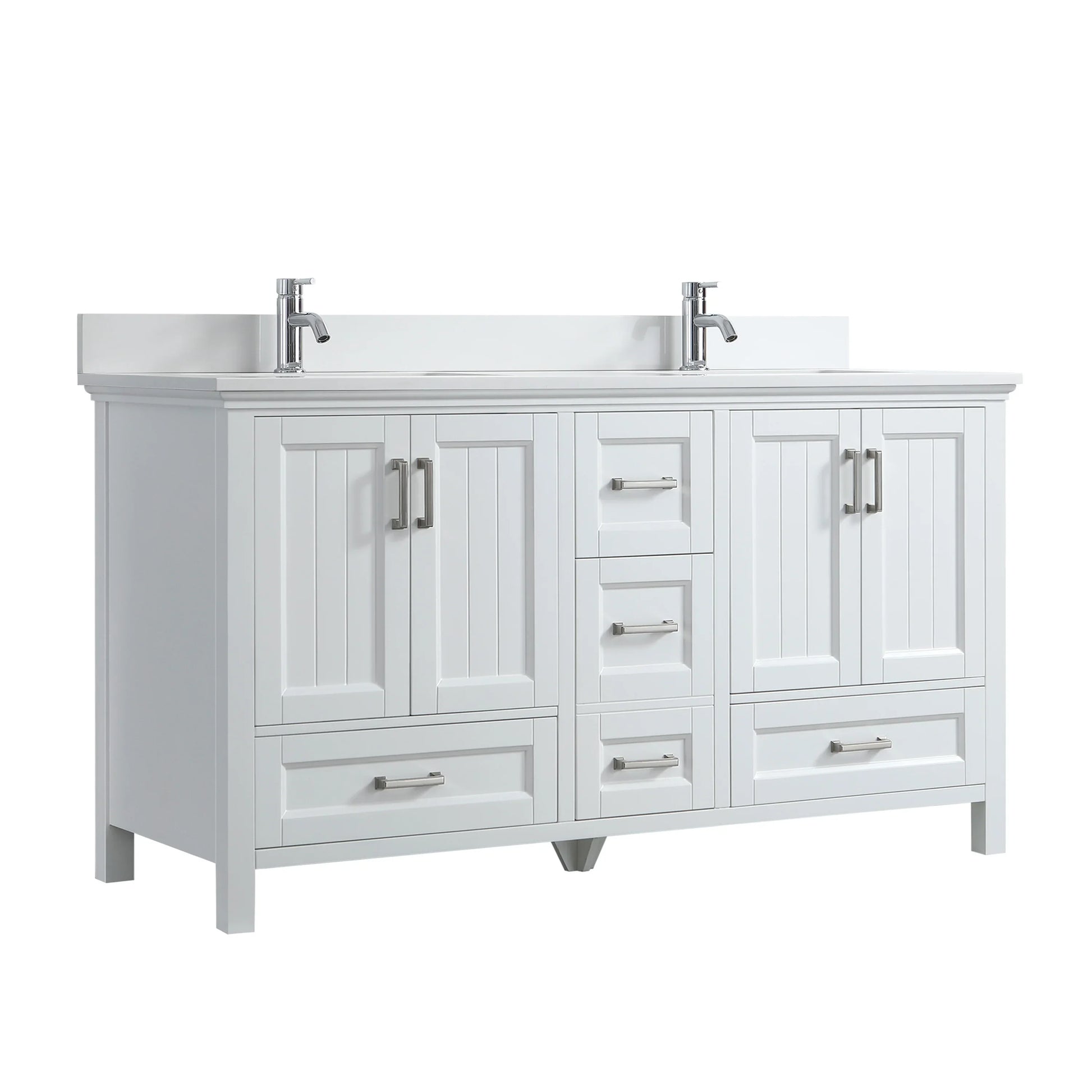 The Nevada vanity comes complete with a luxurious white quartz countertop pre-drilled for two single-hole faucets, paired with undermount rectangular ceramic sinks for a seamless look. German-engineered soft-closing drawer glides and door hinges ensure whisper-quiet operation, while brushed nickel hardware adds a refined finishing touch.