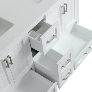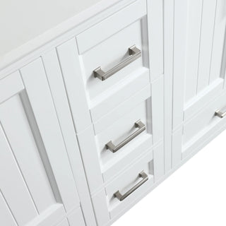 The Nevada 72-inch freestanding vanity blends classic design with modern convenience. Its solid wood frame, matte white finish, and integrated ceramic sinks offer timeless style, while seven soft-closing drawers provide generous storage.
