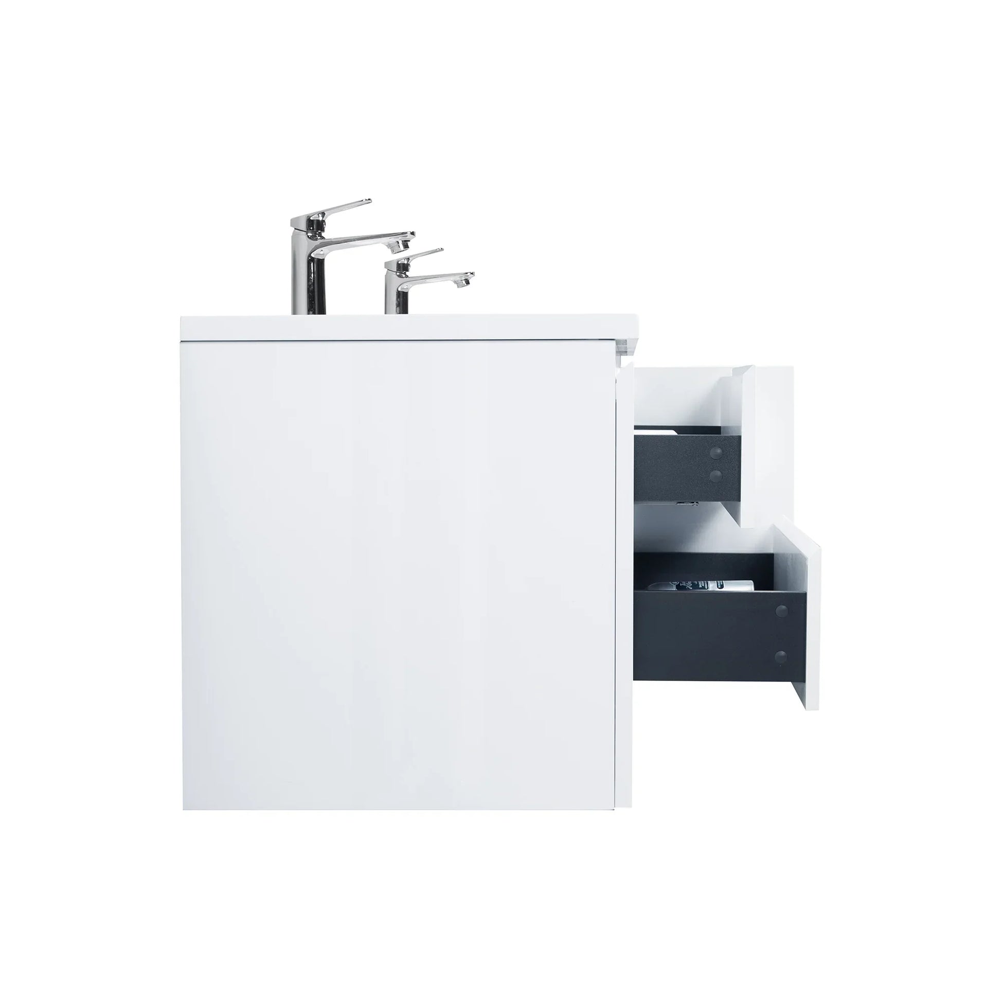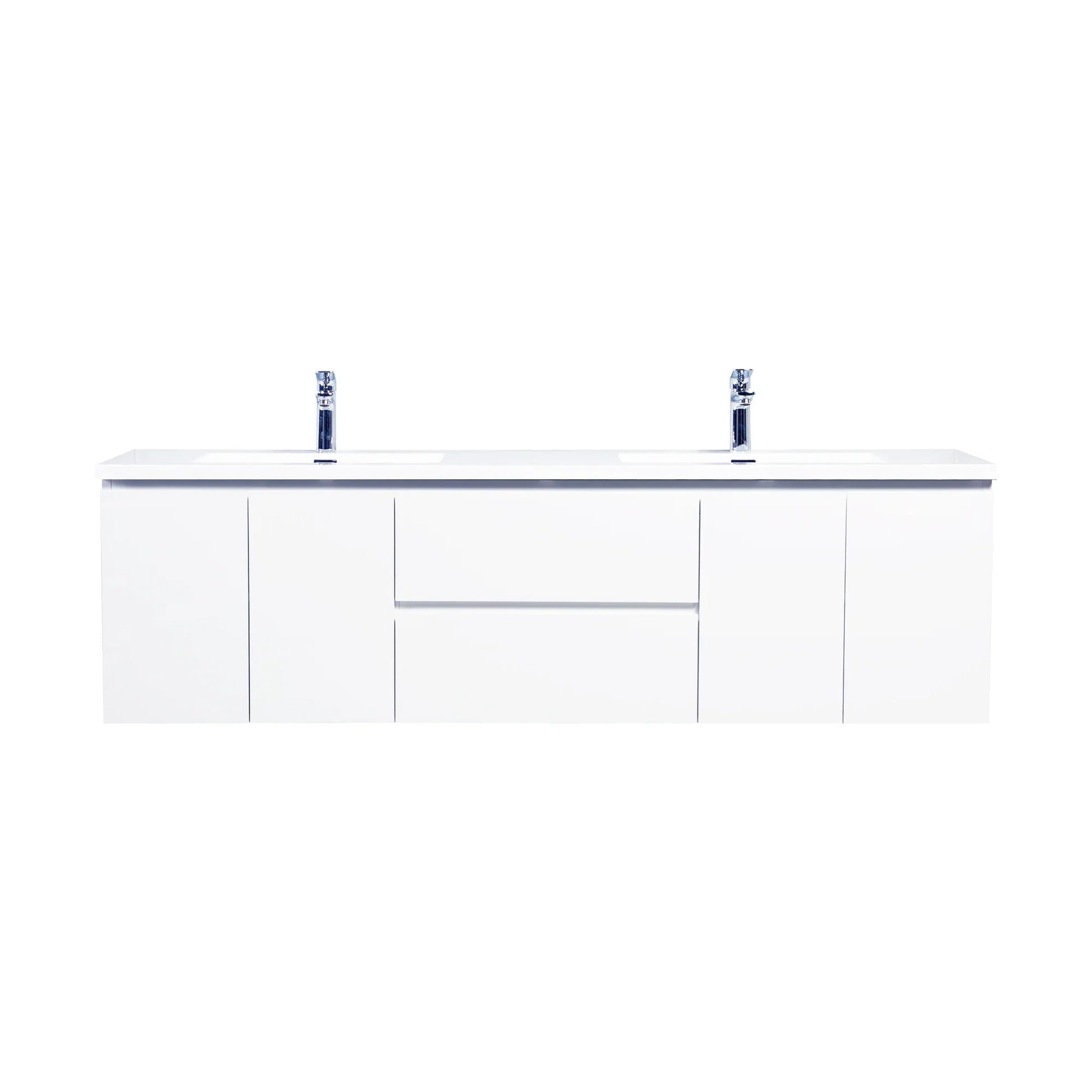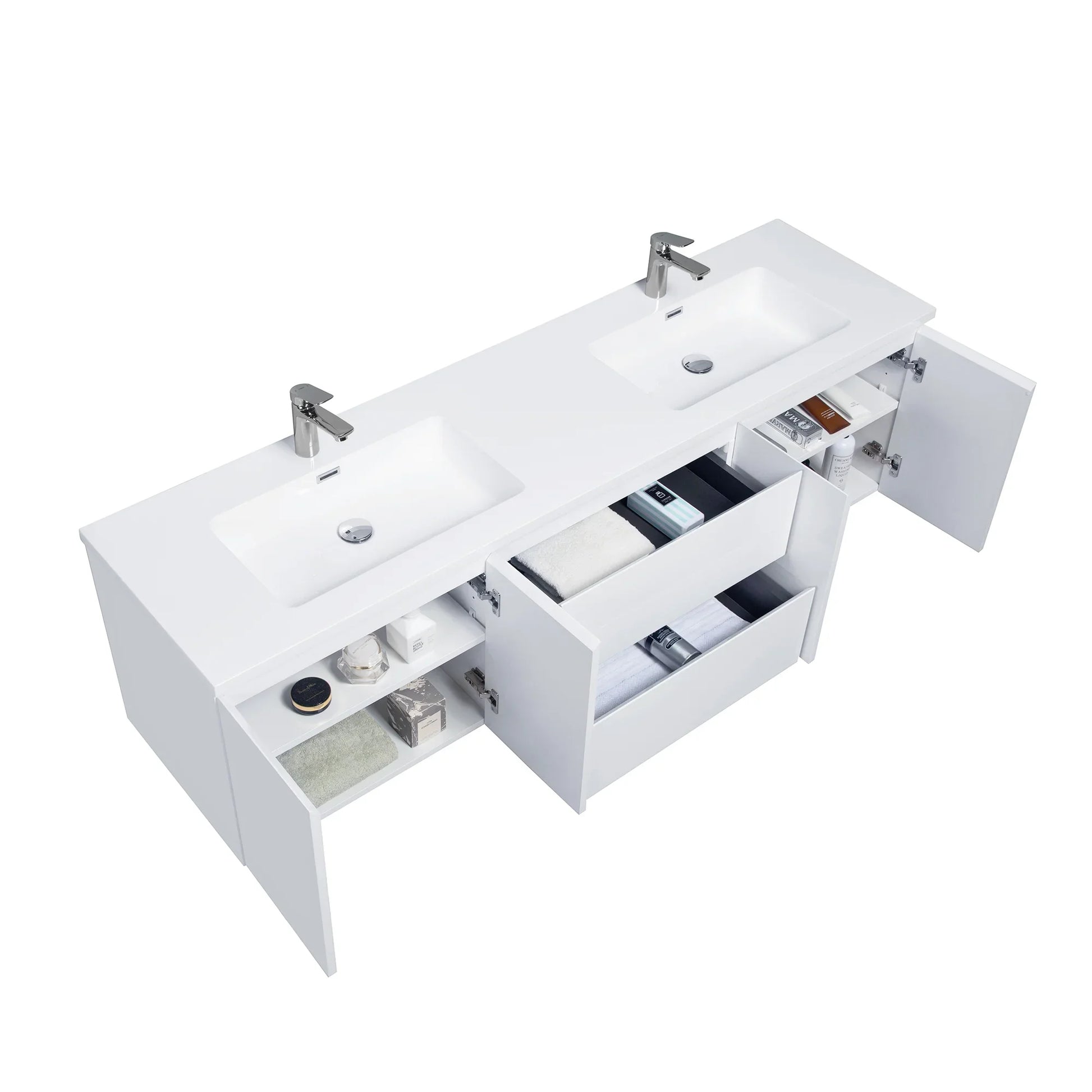 72" White Wall Mount Double Sink Bathroom Vanity with White Polymarble Countertop