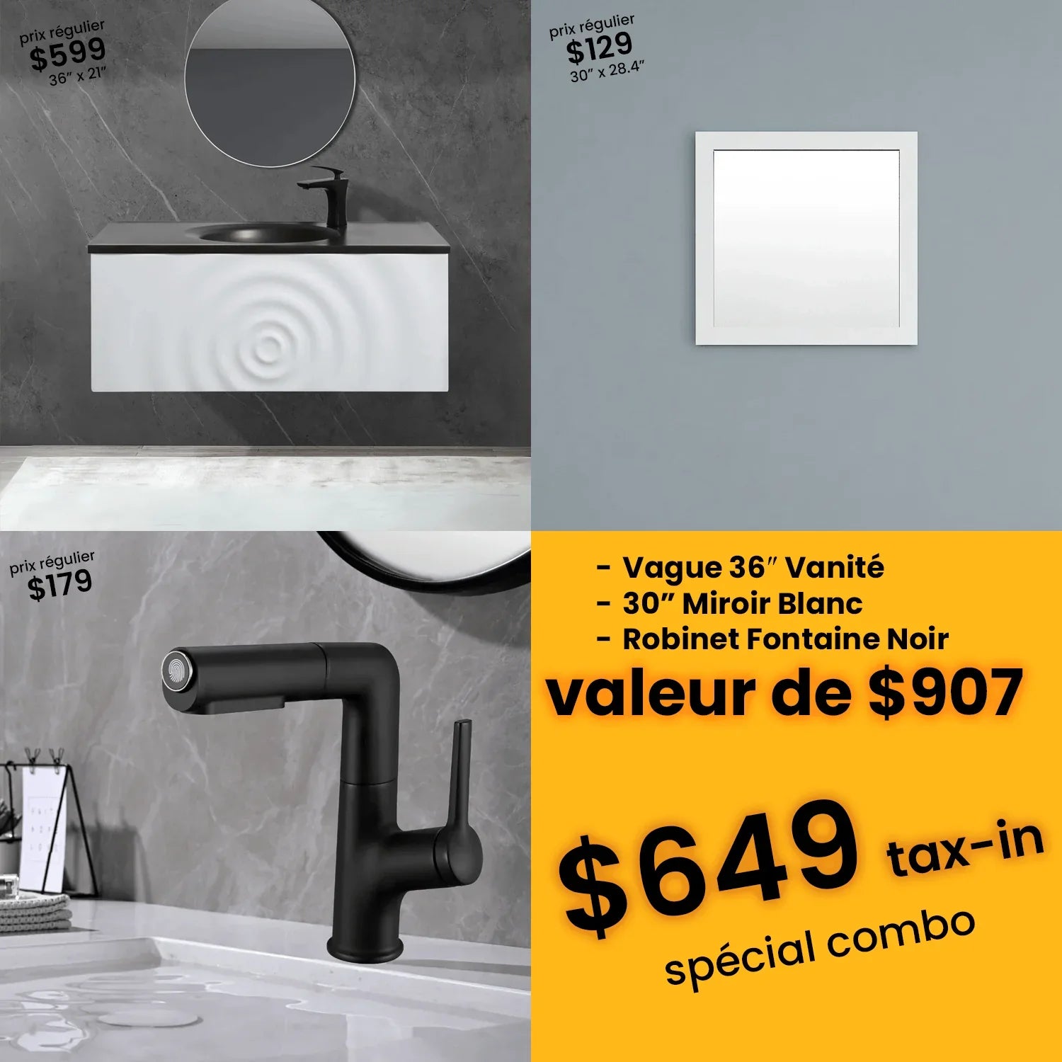 Individually priced at $907, this all-in-one bundle gives you a complete, coordinated bathroom solution at a fraction of the price. Whether you're updating a small space or building new, the Combo Set offers style, storage, and practicality — all for $649 tax-in.