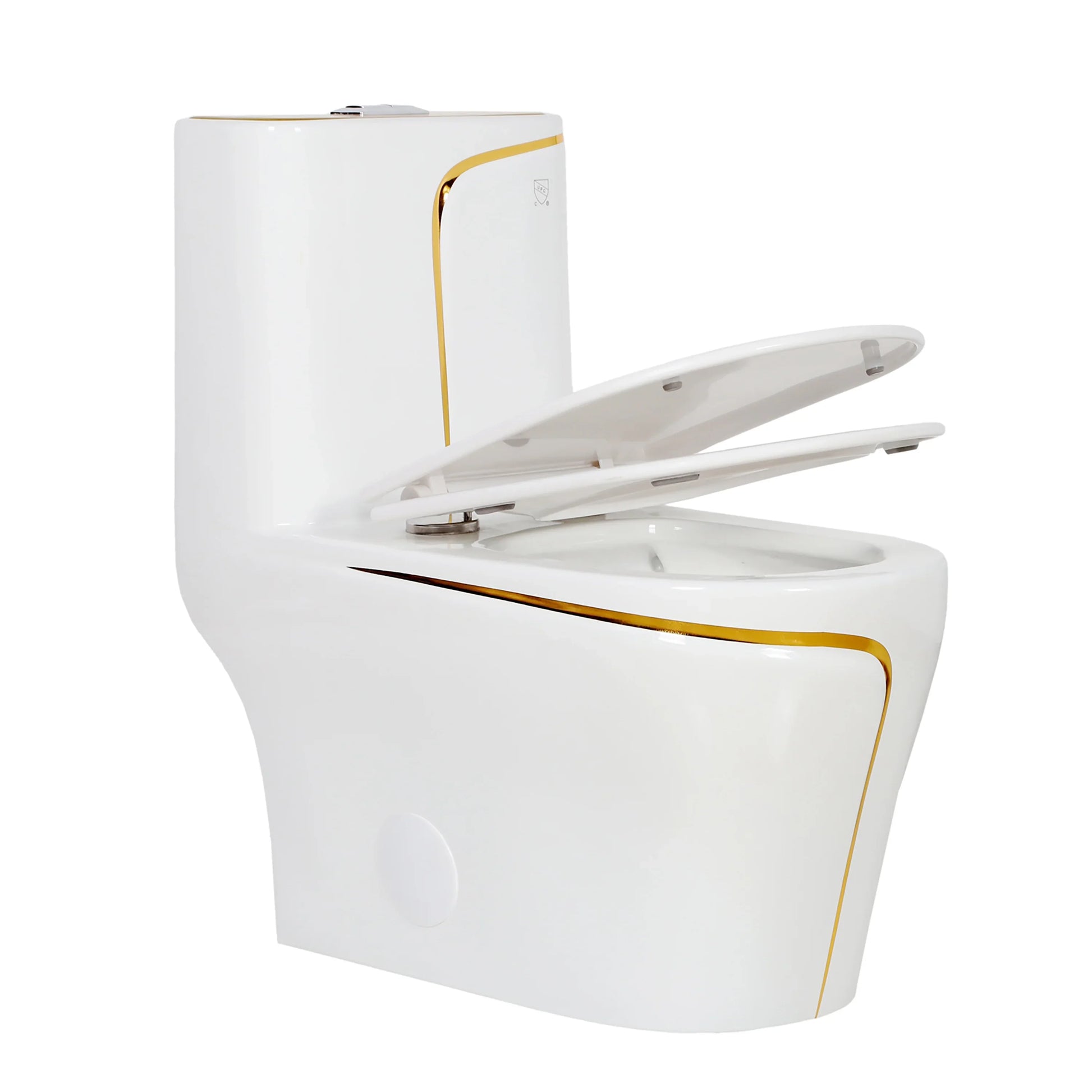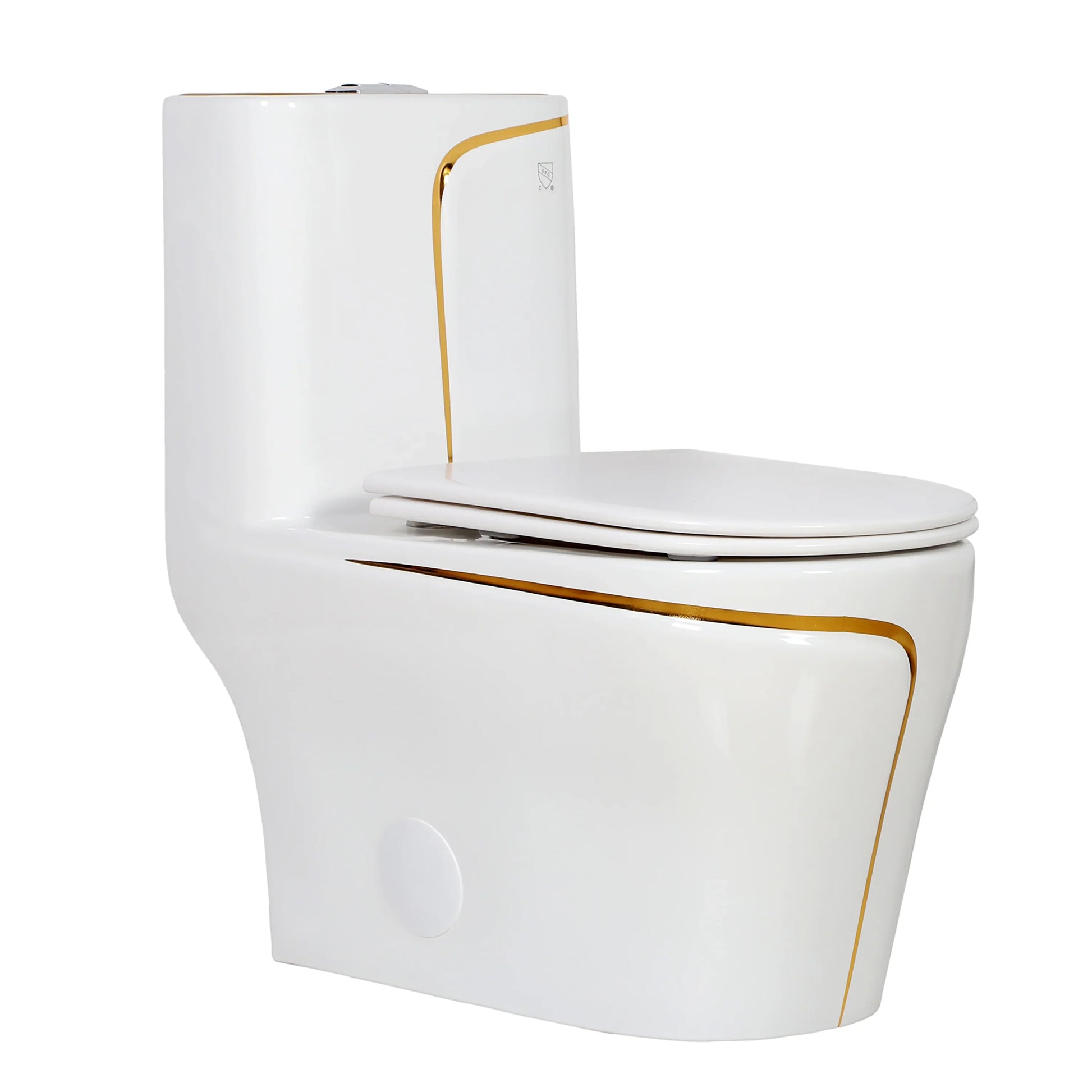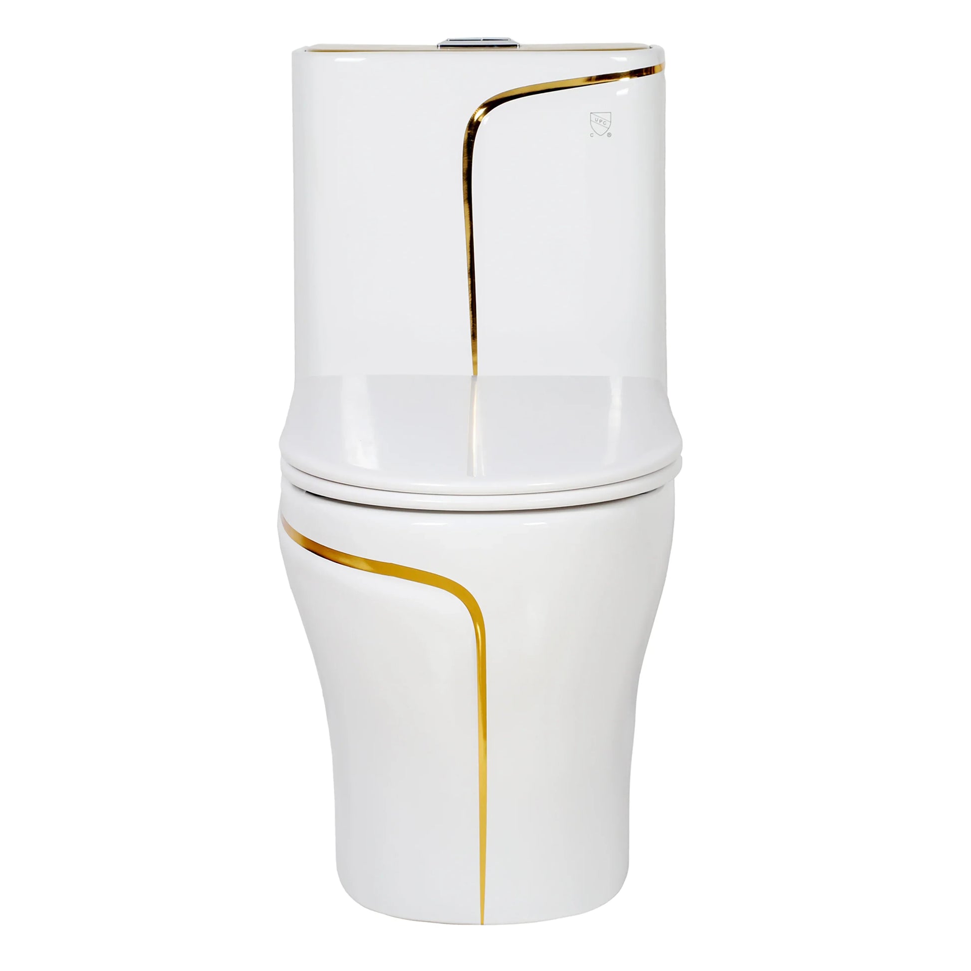 Add a touch of modern luxury to your bathroom with the Calcutta One Piece Toilet, designed to impress with both its performance and style. Crafted with smooth, high-gloss ceramic, this contemporary fixture features a clean, minimalist silhouette highlighted by elegant gold accents, creating a stunning contrast against its crisp white base.