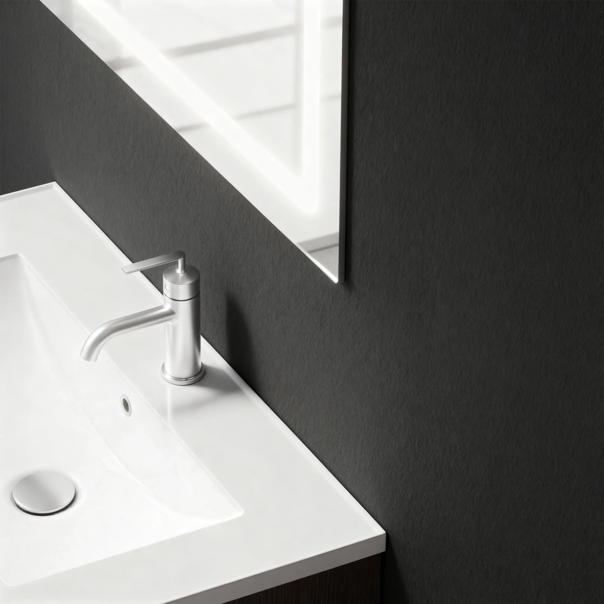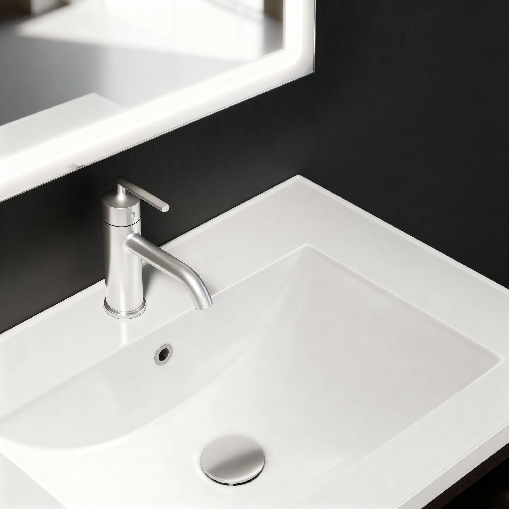 Complementing this is the integrated sink, which merges seamlessly with the countertop for a sleek, unified appearance. This collection is perfect for those who appreciate the beauty of simplicity and the functionality of thoughtful design, turning any bathroom into a modern sanctuary.