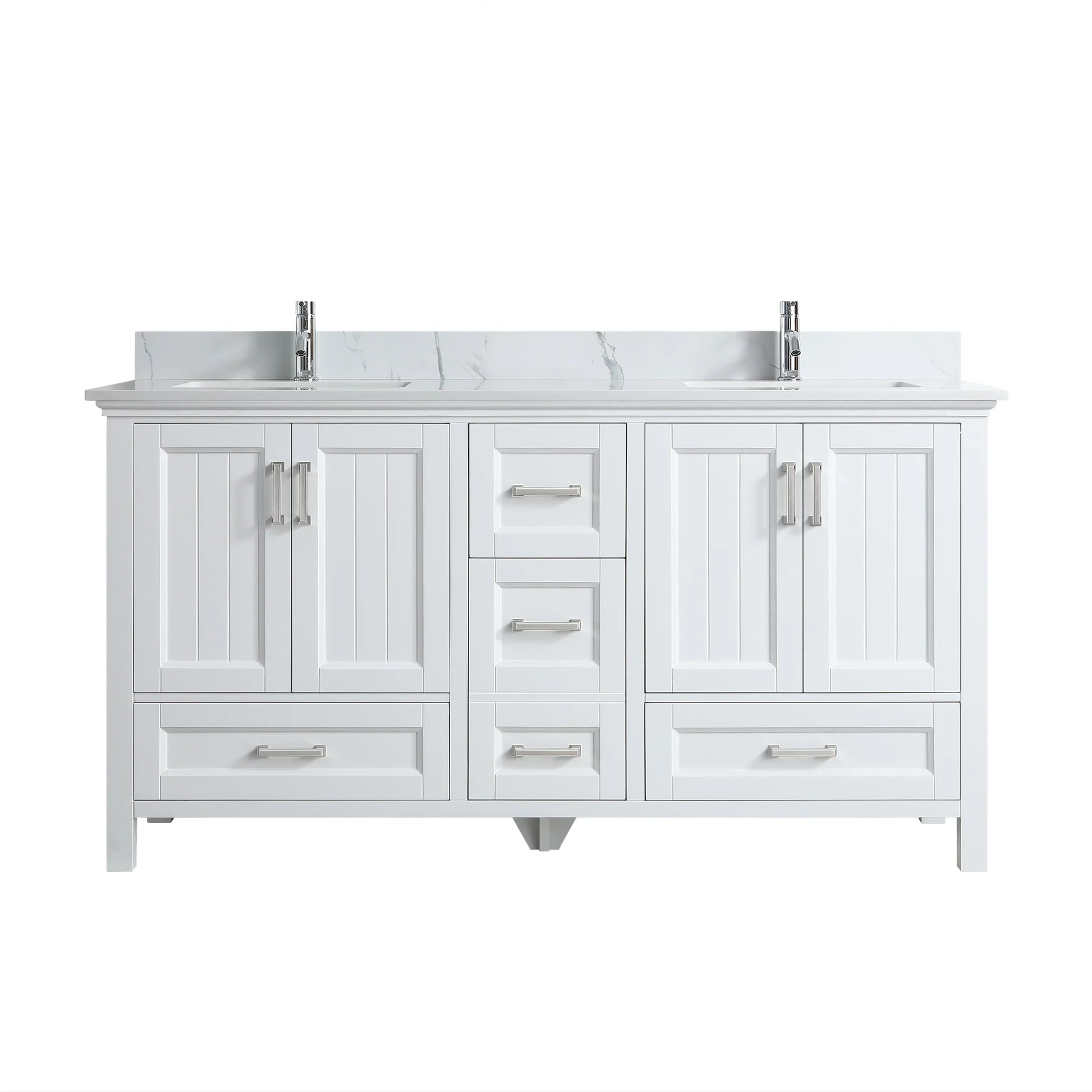 Crafted with a solid wood frame and finished with six coats of hand-applied lacquer, this bathroom vanity delivers lasting durability. The engineered Calcutta marble countertop showcases elegant grey veining against a white background, complemented by two integrated white rectangular undermount sinks pre-drilled for single-hole faucets.