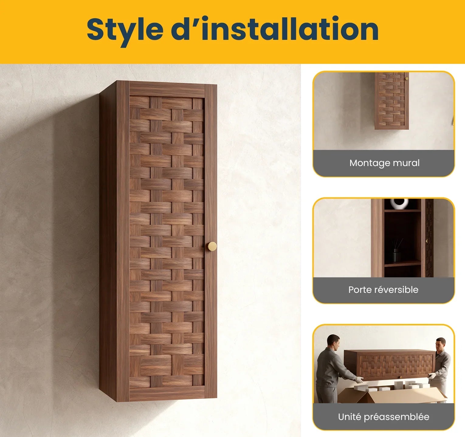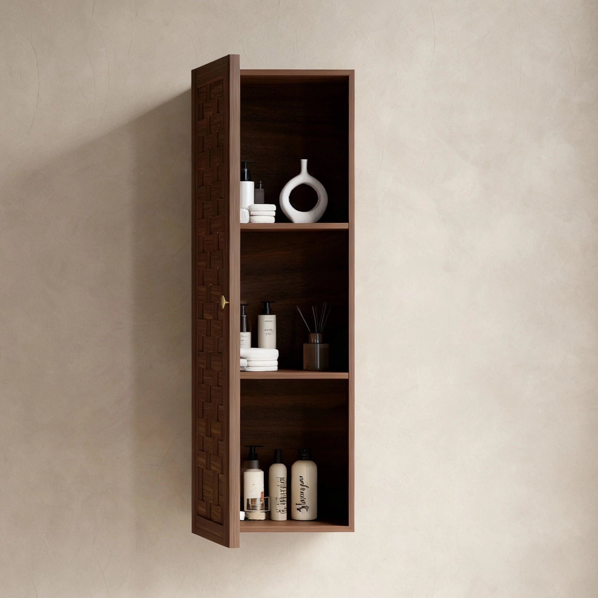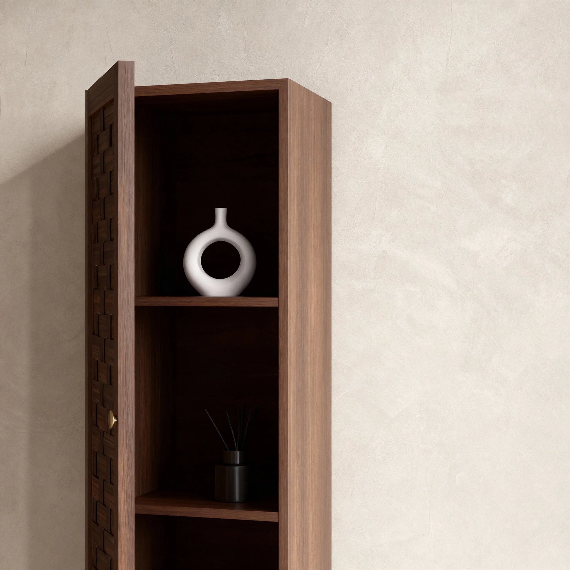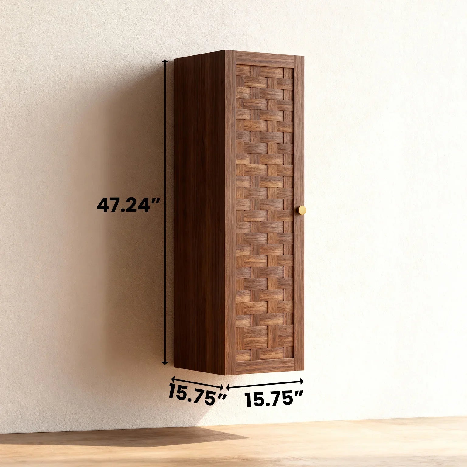 Elevate your bathroom with the Toulouse wall-mounted side cabinet, a stunning storage solution that combines artisan craftsmanship with functional design. This elegant piece features a distinctive woven wood front panel in rich American walnut, creating a warm, textured focal point that transforms ordinary storage into a statement piece.